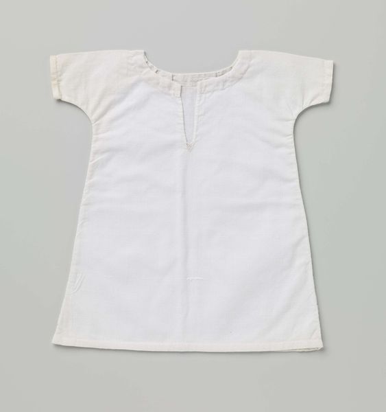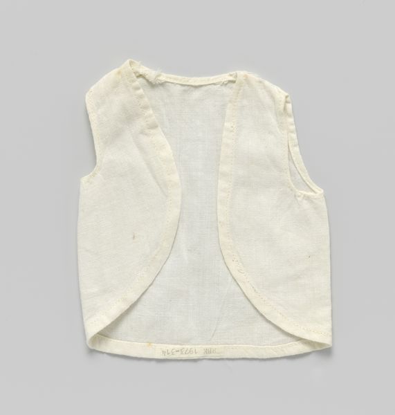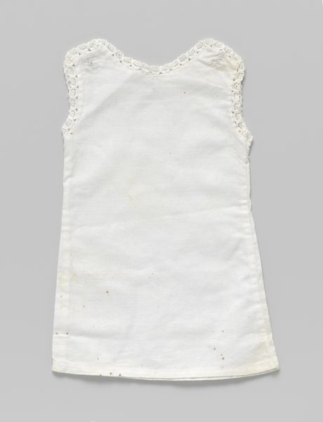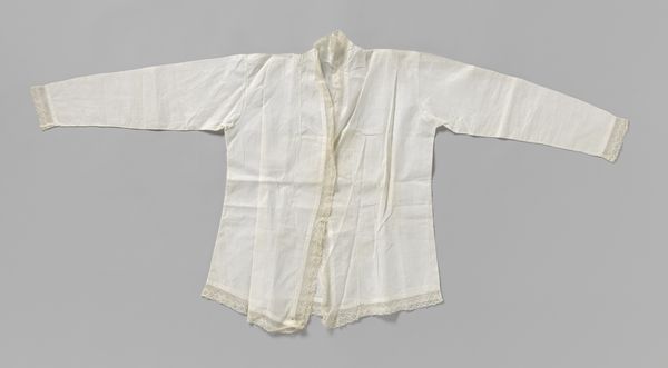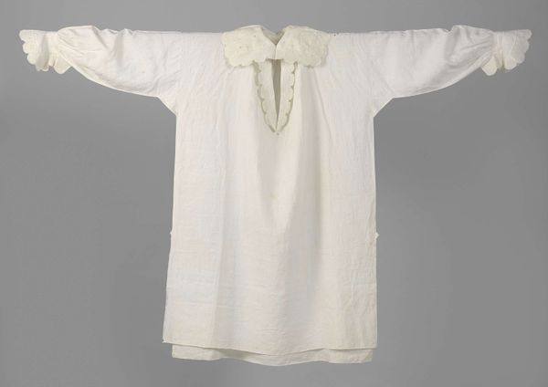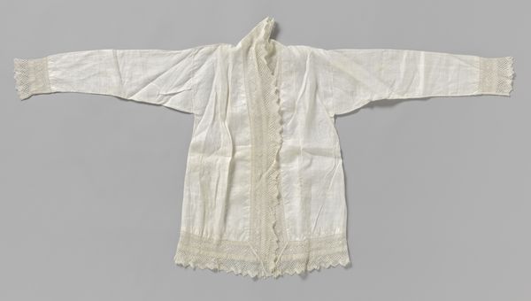 Curator: Our next piece is a cotton shirt, featuring a zigzag band, created around 1910 by P. Titjen-Baas. Editor: It’s so simple, almost austere. The white cotton gives it an impression of purity, yet the visible weave suggests a homespun quality, which feels quite grounded. Curator: Indeed. The raw cotton material emphasizes a key value of the Arts and Crafts movement. Its proponents advocated for simpler forms and the inherent beauty of materials. Editor: Note how the shirt’s design is dictated by the weave structure itself. The seams are clean, almost minimal. Do you think it signals a move away from more ornamental Victorian garments? Curator: Absolutely. It rejects the excess ornamentation of mass-produced goods in favour of function and honest construction. It’s really interesting how the texture becomes the defining aesthetic. The little fringes and tied elements lend softness to the hard edges. Editor: Consider the garment's role beyond mere utility; It’s a visual statement about values and ways of living in that period. This shirt almost declares, "I value simplicity and authenticity." Curator: The historical context informs so much here. Around 1910, increased industrialization drove social reform movements toward sustainability, so it also signals the embrace of pre-industrial processes. Editor: Absolutely. One can envision this piece in the context of burgeoning utopian societies that questioned traditional roles and expectations, and aimed for more communal approaches to living. Curator: Looking closer at the structural aspects, the shape itself, quite loose and unconfining, represents that new, simplified silhouette popular at the time, mirroring social shifts in women’s emancipation. Editor: What do you think a modern observer gains by reflecting on such an object? What impact does seeing these domestic Arts and Crafts textiles have today? Curator: It’s a refreshing counterpoint to our fast-fashion consumer culture. "Hemd van katoen, met zigzagband" encourages an awareness of craft, material, and labour involved in all we wear. Editor: I see the value in revisiting this moment of recalibration of production in society and how we imbue art objects, in this case even clothing, with ideological intent.