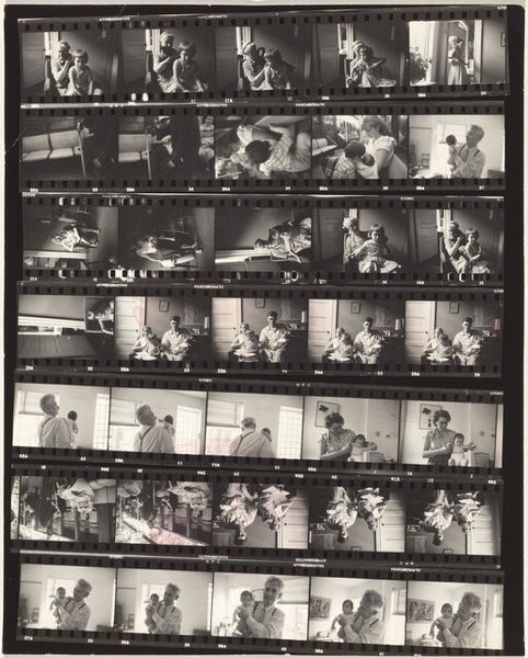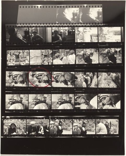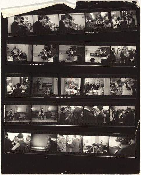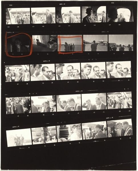 Editor: This is "John F. Kennedy--Nixon campaign 14," a 1960 print by Robert Frank. It's a contact sheet, so lots of small images showing both candidates, Kennedy and Nixon, in the middle of their campaign. What strikes me is the raw, almost documentary feel. What do you see in this image, beyond the surface? Curator: I see the layering of symbols that speak to America's evolving identity. Notice how the individual frames capture fleeting moments. Consider the collective cultural memory of the 1960s – the anxieties, the aspirations. Do you notice any repeating visual elements? Editor: Well, the candidates' faces appear in many frames. Kennedy looks charismatic, almost regal. Nixon appears more...stern, perhaps? Is Frank trying to tell a story with these juxtapositions? Curator: Indeed. These aren't simply portraits. Frank is delving into archetypes. Think about what each man represented. Kennedy, the youthful ideal; Nixon, the established order. Look at their positioning within the frame. Where does your eye go? What emotions do the images evoke? Editor: My eye keeps going back to the contrast between their expressions, their perceived "aura." Kennedy appears much more relaxed and optimistic while Nixon seems... uptight. Does this say something about Frank's feelings toward either candidate? Curator: Perhaps, but it's also about how those images resonated with the American psyche at the time. It's a record of a moment when America was on the cusp of great change, and this is echoed in the symbology Frank presents here. It is up to us to explore the image to unveil the deep connections to who we are. Editor: I never thought a contact sheet could hold so much symbolic weight. It is an invaluable exploration into a pivotal period. Thank you.