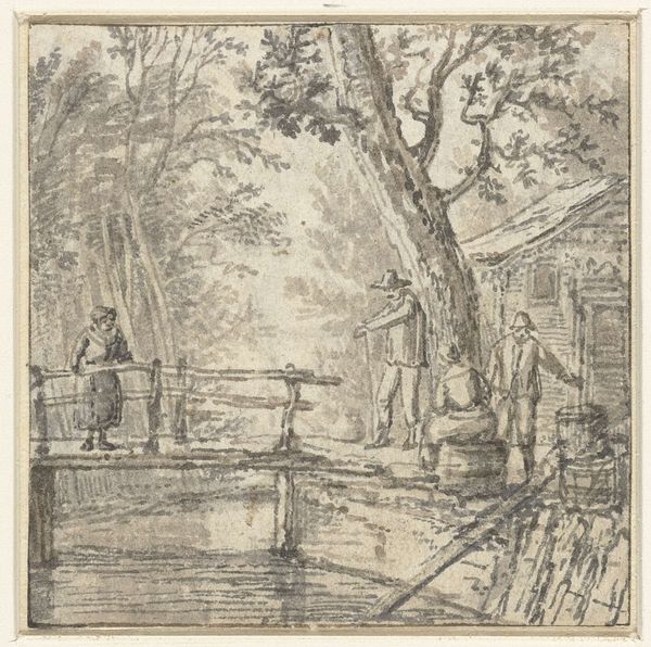 This small drawing, titled "Boerenwoning," or "Farmhouse," is rendered in pen and brown ink by an anonymous artist. The building’s dark doorway beckons from beneath a heavy thatch roof, surrounded by dense foliage and still water. While we don't know who created this image, its very anonymity speaks volumes about the lives of those who inhabited such dwellings. This intimate portrayal of rural life invites us to consider the daily experiences of peasants, who were often marginalized. The drawing refrains from romanticizing rural existence, acknowledging the physical labor that tied them to the land. Notice how the artist’s choice of muted brown ink creates a subdued, almost melancholic mood. The small scale encourages a quiet contemplation of the lives lived within and around this humble abode, a sensitive portrayal of working-class life.