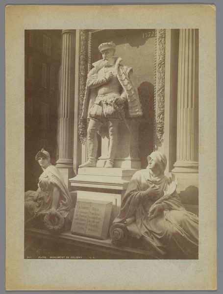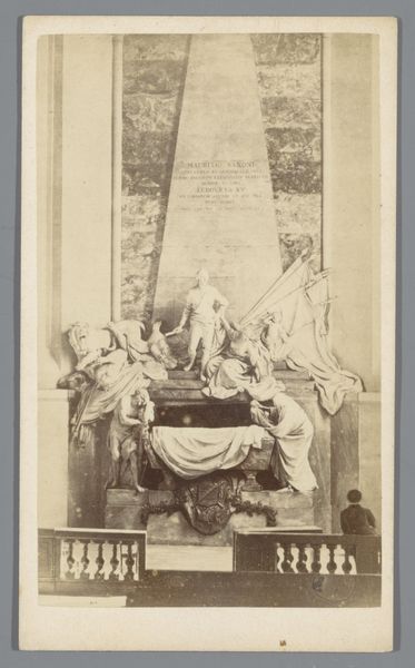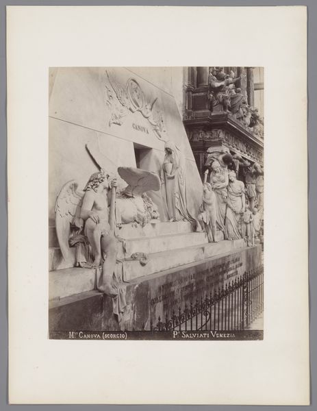 This photograph by Carlo Ponti captures the Grafmonument for Antonio Canova in Venice. The monument itself is a complex assemblage of carved figures, rendered in white marble. A laborious, subtractive process, the carving involved skilled artisans, who would have translated Canova's vision into physical form. Marble’s inherent qualities of weight, texture, and color, all contribute to the monument’s solemn presence. The figures represent grieving allegorical figures, and together with the pyramid shape, produce a scene of neoclassical mourning. While Canova was the celebrated artist, the actual labor was distributed among many hands. Ponti’s photograph collapses that division of labor, freezing the monument at a particular moment in time. In so doing, it serves as a reminder of the collaborative nature of artistic production. The photograph prompts us to consider the social context, and the many contributions required to create such an impressive artwork.