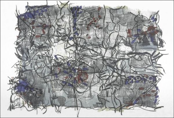 Editor: This is Joyce Kozloff's "Bodies of Water - Cities of China" from 1997. It's a mixed-media piece, with painting and watercolor. The work has a strange yet calming effect because of its blend of abstract and somewhat geometric pattern. It almost feels like looking at an unconventional map. What do you see in this piece? Curator: Primarily, I observe a compelling interplay of form and color. Note the artist's manipulation of line; how it segments the pictorial plane, generating tension between discrete zones. This strategy prompts an examination of spatial relationships and divisions within the work. Also, the application of color - subdued and muted, in contrast to the vibrancy typical of decorative art, complicating a simple reading. The patterns avoid clear representation, and do not commit to pure abstraction either. What effects do you think such resistance to clear categorization has? Editor: That makes a lot of sense, since I wondered whether it was representational or abstract. So it seems as though Kozloff does not take a side, and intentionally challenges easy labels through this piece. It seems I learn that close analysis will get you somewhere. I appreciate your input, especially your emphasizing attention to forms, colors and patterns as opposed to an art history class that would demand cultural background information. Curator: It's a fascinating piece because it highlights the critical role that pure observation plays in how one makes sense of and then experiences the work, by slowing down our rush to interpretation and engaging the work at a visual level.