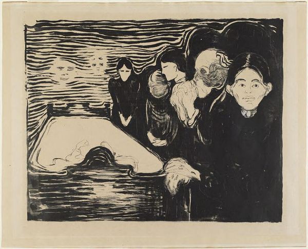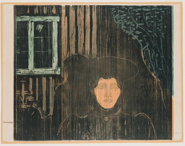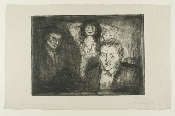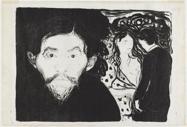 Editor: This is Edvard Munch's "Jealousy II" housed at the Harvard Art Museums. I'm immediately struck by the stark contrast and the haunting expression on the foregrounded figure’s face. How do you interpret the composition of this work? Curator: The power of this image resides within its formal arrangement. Observe how Munch employs a restricted palette to amplify the emotional weight. The foreground figure, rendered with striking lines, visually dominates, while the couple in the background are almost swallowed by the darkness. Editor: So, the visual imbalance emphasizes the man's isolation and internal turmoil? Curator: Precisely. Consider how the swirling lines of the landscape mirror the turbulent emotions suggested by the man’s exaggerated features. The composition itself becomes a visual metaphor for jealousy. Editor: I see that now. Thanks, that clarified a lot about how form can communicate emotion.