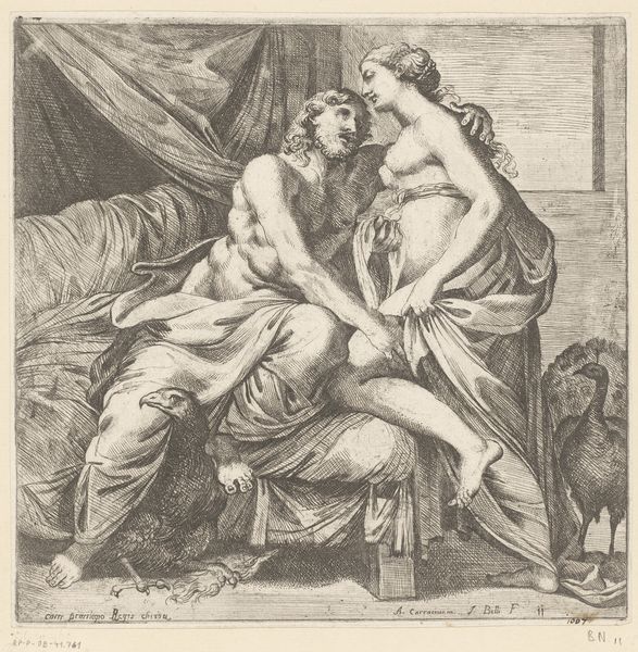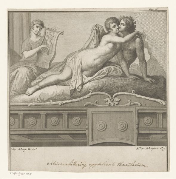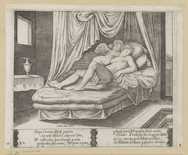Curator: Let’s discuss “Amor en Psyche als geliefden,” an engraving crafted circa 1530-1560, now housed at the Rijksmuseum. The work is credited to the Master of the Die, known for their proliferation of prints across Italy and Northern Europe during the High Renaissance. Editor: My first impression is of stark contrasts, a somber yet sensual scene created through intricate, almost obsessively detailed crosshatching. The subjects seem caught between vulnerability and erotic display. Curator: The engraving portrays a very intimate moment from the classical myth. Cupid, usually an archer as you can see by the discarded weapons on the floor, embraces Psyche after they have made love. The abandonment of the bow and quiver suggests love surpassing mere carnal desire, alluding to psychological union and spiritual completion. Editor: Indeed, there is an abandonment suggested by the discarded weaponry, but notice also how Cupid is depicted on top of Psyche. Structurally, this highlights not equality, but rather dominance—visually reinforcing the inherent power dynamics and social positions prevalent in Italian Renaissance representations of gender. It challenges any purely symbolic reading of mutual completion that would obscure that dynamic. Curator: I understand your emphasis, but there's something profoundly sympathetic in their embrace. There's an awareness of touch here, as we examine the intimacy from a distance of centuries; an immortal God intimately tied to mortal concerns, mirroring perhaps, our own complex entanglement with earthly desire and the hope for transcendence. Editor: Fair enough. There is undeniably great emotive depth achieved through relatively basic materials—metal and ink on paper, used to such convincing effect, especially regarding shadow and form. The almost sculptural quality achieved simply through line and tone continues to resonate, forcing one to admire the artist's control over their medium. Curator: Ultimately, it’s a moving portrayal of love’s contradictions: powerful and disarming, sensual yet steeped in the language of psychological allegory. The myth retains its emotive significance across millennia. Editor: Agreed. And dissecting the formal and symbolic tensions at play only enriches our appreciation of its nuanced beauty, the ways in which it reveals more with each viewing.