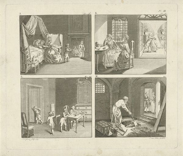 Curator: Let’s discuss Daniel Nikolaus Chodowiecki’s "Menselijke karaktertrekken" or “Human characteristics,” an engraving from 1769 housed here at the Rijksmuseum. Editor: My first thought is that there is an attempt at narrative sequencing with each vignette, despite the seemingly limited color palette. It's all lines, delineations, and careful textures. I immediately perceive that each separate composition may point to universalities about behaviors that repeat and reflect throughout culture and society. Curator: Indeed, observe how the composition divides the sheet into four distinct scenes. This organizational structure mirrors the Enlightenment’s passion for categorization, a systematic way of understanding human behavior. Each pane represents distinct spaces but it is the subtle ways that space is being used for symbolic gestures that holds cultural meanings. Editor: Precisely. Consider the symbolism inherent in domestic scenes like that in the upper-left panel. We have a patriarchal male figure seemingly recovering on the divan, in need of nursing. Even if unintentional, Chodowiecki gives his characters recognizable idiosyncrasies through posture, gaze, and staging within a shared interior space. The symbols indicate dependency, and familial bonds, perhaps speaking to broader cultural narratives regarding societal structure at the time? Curator: Certainly. Look, too, at how Chodowiecki uses line work. The crisp lines against the blank space generate implied value and dimension. This lends a very controlled precision which reflects the social control under the guise of “civilization” happening across Europe. In some ways this piece also serves as a mirror reflecting these subtle shifts in morality as it intersects with societal reform. Editor: The fourth quadrant showing an invalid hints to a memento mori. The whole of life in stages is subtly placed alongside social commentary, perhaps hinting that humanity as a whole is unwell, that humanity is flawed. Curator: Perhaps. These vignettes are windows into the attitudes of a rising bourgeois class. Editor: This piece invites multiple interpretations that encourage active viewing, wouldn't you agree? Curator: Precisely; a reminder that even within strict visual structure there is always room for meaning.