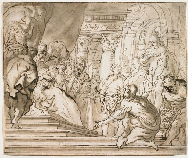 Jacob van der Ulft created this drawing, "Orientalischer Fürst auf dem Thron, dem Geschenke gebracht werden" using pen and brush in brown and gray. Notice how van der Ulft constructs a scene of hierarchical display, dominated by architectural elements and human figures rendered with equal detail. The composition is rigidly structured, with the central figure elevated on a throne, literally and figuratively above the adoring crowd. The artist pays close attention to the interplay of light and shadow, creating depth through tonal contrasts, particularly in the drapery and architectural details. Ulft employs a semiotic system of signs, where classical columns symbolize power, and the act of gift-giving reinforces established social hierarchies. Consider how the artwork engages with post-structuralist themes by visually reinforcing social categories and values. Rather than challenging fixed meanings, the drawing entrenches cultural codes of power, representation and perception. While aesthetically pleasing, it prompts questions about how art functions within a larger cultural and philosophical discourse. The drawing is not a singular statement, but rather a complex engagement with ongoing interpretations of power and society.