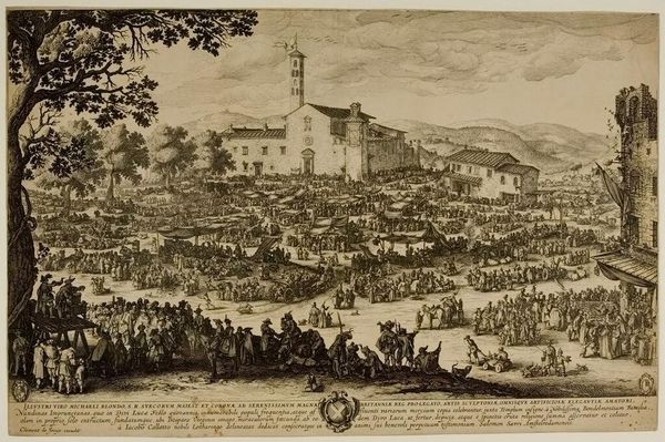 Curator: This intricate scene is Jacques Callot's "Great Fair of the Madonna del Imprunetta," an engraving now residing at the Harvard Art Museums. What captures your attention first? Editor: The sheer density. It's a teeming landscape, yet rendered with such delicate precision. I'm immediately struck by the overwhelming presence of people, packed together like sardines. Curator: The fair itself was a major economic and religious event. Callot, active in the early 17th century, meticulously documented social structures within festival culture. What are the power dynamics we see portrayed? Editor: The church looms large, visually anchoring the print—a symbol of spiritual and temporal authority. But amidst the crowd, all walks of life seem momentarily united, blurring usual social demarcations through commerce and ritual. Curator: Indeed. Consider how Callot’s detailed depiction invites us to analyze the socio-political complexities inherent in public gatherings. The fair acted as a temporary reprieve, yet reinforced existing hierarchies. Editor: For me, the recurring motif of figures clustered around makeshift stalls speaks to enduring themes of exchange and survival. It suggests both opportunity and perhaps exploitation. Curator: Examining the legacy of such imagery reveals how public events can both reflect and shape social consciousness. Editor: Seeing such a complete world, I wonder if we today can fully grasp the symbolic gravity a fair held in that era.
