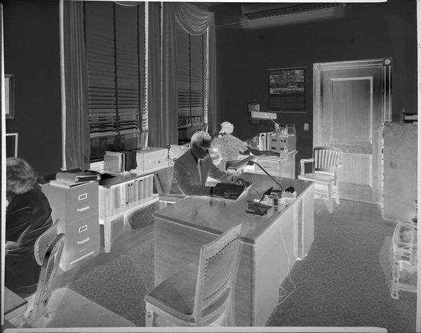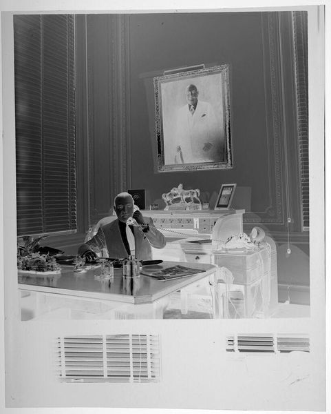 Curator: This photograph, simply titled "man at desk, reading," comes to us from Peter James Studio. It's a gelatin silver print, measuring about 4 by 5 inches. Editor: It’s striking how much the image speaks of mid-century masculinity. The neat suit, the reading, the books… a particular aspiration is being staged here. Curator: The items carry a certain weight, yes. The book he's holding, the stacks of books around him, all present potent symbols of knowledge and authority. Even the phone, a tool of communication, speaks to his position. Editor: But it also feels very composed, almost like an advertisement for the aspirational professional. It makes me wonder about the circumstances under which it was produced, and what role images like this played in shaping public perception. Curator: Perhaps the image is less about the individual and more about projecting an ideal? A continuity of learning and civic duty signified through these commonplace objects. Editor: A very constructed reality, offering a glimpse into the values projected onto men of that era. Curator: Indeed, a potent reminder of how images can encode cultural ideals.