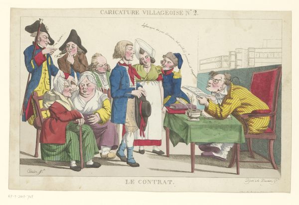 Curator: This engraving by Jacob Ernst Marcus, dating from 1800-1805, is entitled "Pruikenmaker" – "The Wig Maker" if you will. What strikes you most upon viewing it? Editor: Immediately, the sheer theatricality! It's so exaggerated. The light, feathery lines give it a somewhat absurd, almost dreamlike quality. Curator: Indeed, Marcus cleverly employs caricature to deliver social commentary. The print teems with figures fixated on wigs, which were a potent symbol of status and power in the late 18th and early 19th centuries. Note the rows of bewigged onlookers behind the seated figures. Editor: You can almost feel the weight of expectation from these wig connoisseurs. The composition directs the viewer's eye right to the center table where the exchange takes place; it’s very controlled. The wigs themselves—arranged like specimens on the shelf above, contribute to the scientific aesthetic. Curator: Precisely. Marcus highlights the emerging bourgeois society obsessed with appearances and professional advancement. Consider how the fashion for elaborate wigs dominated society, so someone's very identity became performative and even comedic. This piece satirizes that societal fixation. Editor: And it really gets to the root...pun intended! The stark lighting contrasts beautifully with the softer gradations to enhance the theatrical quality of this rather judgmental symposium of sorts. Do you think the printmaker succeeded in satirizing that "lust to investigate" referenced in the title? Curator: Absolutely. Marcus presents us with a rather unflattering mirror. It really questions the value system of the time. By reducing these wig-obsessed figures to caricatures, Marcus incites a chuckle, yes, but he also encourages deeper thought. Editor: Ultimately, this engraving reveals just how potent satire can be to illuminate social anxieties, while creating some rather memorable portraits! Curator: A valuable piece not just for its artistry but its snapshot into history. It really encourages a richer understanding of class and society at this historical moment.