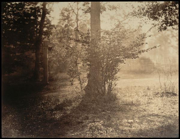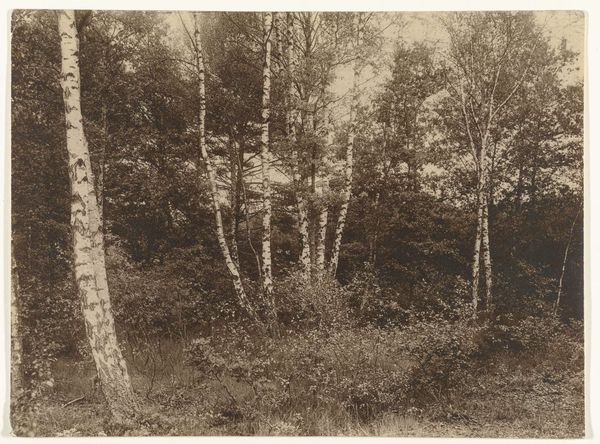 Editor: We're looking at "Near the Bodmer Oak, Fontainebleau," a photograph from the 1860s by Eugène Cuvelier, rendered in gelatin silver print. It’s held at the Met. It feels so still, so full of a hushed kind of reverence, like stepping into a cathedral made of trees. What do you see in this piece, beyond the obvious trees and foliage? Curator: More than you might think, actually. I see Cuvelier inviting us into a dialogue about photography itself. Think about it: in the 1860s, photography was still wrestling with its identity as art. Landscape painters were hugely popular, capturing grand vistas. Here, Cuvelier offers us something quieter, more intimate, and perhaps even a little subversive. The soft focus, the dappled light…does it remind you of any paintings of the time? Editor: Hmm, maybe Impressionism, with the emphasis on light, but those didn't really come to fruition until the 1870’s. Curator: True, but the seeds were there, a yearning for a new way of seeing. What is truly captivating is the feeling that we’re stepping into Cuvelier’s own experience of being in this forest. He is present, not simply documenting nature from a distance, which in turn, offers us an intensely romantic encounter of forest bathing through the lens. I see here a rejection of painting and instead the first step toward something different and just as exciting: the truth of light. Editor: So, less about capturing the “perfect” scene and more about capturing a feeling? Curator: Precisely! Perhaps that's where the lasting magic of this photograph resides, and why it still beckons us today. Editor: That makes a lot of sense. I will now go off into the woods with my camera in the search of "a feeling." Thanks for this wonderful encounter. Curator: Wonderful. Farewell, now!