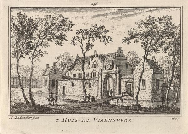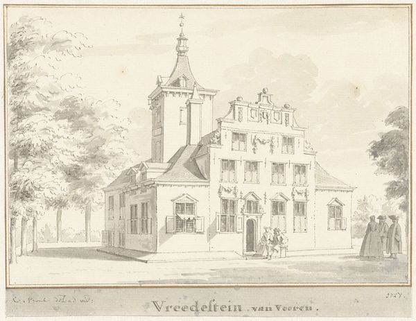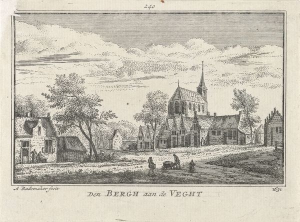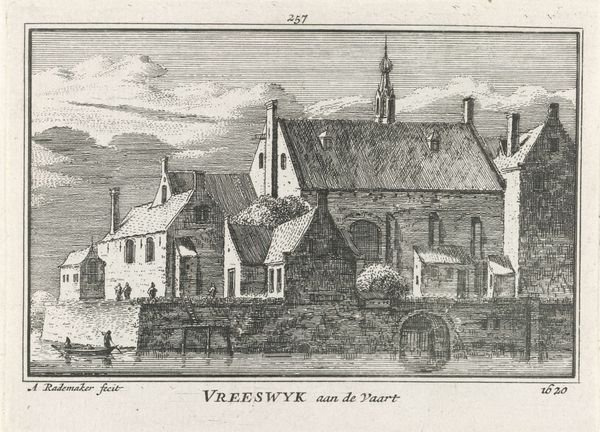 This is Abraham Rademaker's "Gezicht op Vreeswijk," made around 1620. This drawing shows the village of Vreeswijk with a light ethereal aesthetic, achieved through delicate lines and monochromatic shading. The structure of the artwork uses linear perspective, drawing the eye from the foreground's tranquil waterway to the architectural details of the buildings. Notice how Rademaker employs structural clarity, organizing space through geometric forms and contrasting textures. The buildings, rendered with sharp angular lines, stand in contrast to the softer, more organic shapes of the trees and clouds. This creates a visual dichotomy between the man-made and the natural. The semiotic structure relies on recognizable symbols: the church spire signifies spiritual authority, and the boats hint at trade and movement. The arrangement, however, resists a singular reading. The buildings are not merely representative but become abstract shapes which form a dialogue between form and function. Rademaker prompts us to appreciate the interplay of form and representation, inviting ongoing interpretation.