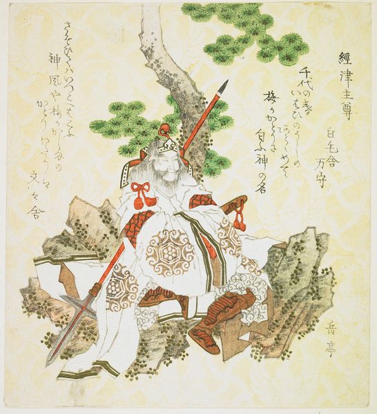 Editor: This is "Gabai pruim", a woodblock print from 1823 by Totoya Hokkei, currently held at the Rijksmuseum. I’m struck by the unusual composition; it’s divided vertically, with text occupying significant visual space. What do you see in this piece that draws your attention? Curator: Immediately, I am drawn to the formal interplay between the calligraphic elements and the depicted forms. Notice how the textures achieved through the woodblock technique, particularly in the rendering of the tree trunk and leaves, create a compelling visual contrast with the flat, patterned areas. What does that juxtaposition suggest to you? Editor: Perhaps a deliberate arrangement to emphasize both depth and flatness? The eye is pulled in by the naturalism of the plant, but also forced back by the stylized writing. Curator: Precisely. And observe the colour palette—the muted greens and reds alongside the creamy background. The tonal relationships are crucial in understanding the print’s structural harmony, how forms echo across different planes. Editor: That’s fascinating. I was focused on trying to decipher the image, and I now understand how the artist employed composition and color to guide my eyes. The text is no longer just information, it is now part of the entire artwork. Curator: The artist's use of medium provides an entirely new lens from which to interpret and analyze this image. Understanding this work through formalism enhances our perception. Editor: Indeed. I'll definitely approach woodblock prints differently now.