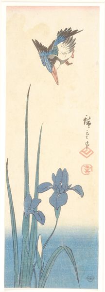 Curator: I am immediately struck by the serenity of this print; there’s a quiet elegance in its simple composition. Editor: Well, let’s provide some context. This watercolor print, titled “Irises”, was created by Ohara Koson sometime between 1900 and 1936. The impressionistic style and delicate lines suggest an exploration of traditional Ukiyo-e themes. Curator: The linework is indeed quite elegant, wouldn’t you say? Note how Koson outlines each petal, achieving a remarkable clarity. And how the color choices work to elevate form, adding layers to the two primary blooms. Editor: Absolutely, yet these irises transcend mere botanical study. Koson painted during a period of intense social change in Japan as it Westernized. These traditional images became commodities intended for Western consumers that perpetuated an idea of the Orient and Orientalism. How does that influence your perception? Curator: I concede, the image could very easily be seen as orientalizing, with its careful selection of aestheticized objects. However, I still argue that within that context, the image's strength relies upon the rendering of depth through contrasting tones, note the near-absence of shadows… Editor: Right, and the inclusion of the natural, uncultivated landscape brings nature’s inherent freedom and strength to bear. How can that be reconciled with commodification? Curator: Perhaps there's a negotiation here, a subtle dance between perceived exoticism and genuine observation of the natural world that renders its own meaning in excess of any political consideration. The diagonal lines of the stems guide us around the frame in quiet meditation, creating dynamism. Editor: Indeed, it is in understanding the dualities, East and West, traditional and modern, the tension is present throughout, even in these elegant irises. Thanks for bringing Koson’s composition into such clear focus. Curator: My pleasure. Analyzing Koson's image and our dialogue is truly insightful, offering layered interpretations beyond initial impressions.