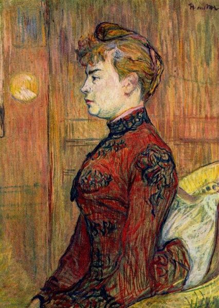 Curator: Here we see Henri de Toulouse-Lautrec's 1887 oil on canvas painting, titled "Comtesse." It resides at the Musee Toulouse-Lautrec, in Albi, France. Editor: My first impression is quiet contemplation. There’s a softness to it, almost a blurring of edges that speaks to the intimate moment depicted. You can almost hear a pin drop. Curator: Intimacy certainly resonates here. Lautrec’s distinctive Post-Impressionist style emphasizes interiority and everyday life—a sense of modern psychological experience. The comtesse is absorbed in her reading; what do you think it signifies? Editor: I think it’s significant to consider what "reading" would have represented. Beyond simple literacy, books in these settings symbolized leisure and wealth, and also intelligence. How interesting is the way this impressionistic painting offers the same level of detail to the room's fabrics, her face, and hands. What was the Comtesse's social rank and status at the time the artwork was painted? What was she reading? Curator: Considering Toulouse-Lautrec’s known predilections, the Countess' pose is probably quite significant: he typically portrays individuals engaged in honest, perhaps vulnerable moments, and it goes against norms of presentation; it’s quite interesting because "Comtesse" speaks not just about a specific person, but about representations of the nobility more generally, too. Editor: Absolutely, and to see it rendered with such obvious brushstrokes—almost coarse in places—complicates that association with refinement. The materials of painting betray a certain…commonness. Did Lautrec engage with a patron for its execution, or was the painting independent from external factors? Curator: Considering this aspect through cultural lenses, Lautrec wasn’t interested in rendering a social rank, instead he captured psychological and social dimensions. Perhaps even commenting on his subject's intellect beyond their societal position. Editor: It truly subverts expectations, doesn't it? I came in looking at the title of the painting with its promise of nobility, but am more touched by her absorption and quiet intellectuality. Curator: Exactly! It challenges viewers to reconsider the traditional narratives and impressions linked with that rank. I hadn't quite registered the shift that the name creates. Editor: I find it really powerful to observe these moments, that is: observing our social memory, its making, and undoing, thanks to artists' use of their materials. Curator: Precisely. "Comtesse" invites us to look beyond surface appearances and examine the rich internal lives of its subject and their relationship to the symbolic world surrounding them.