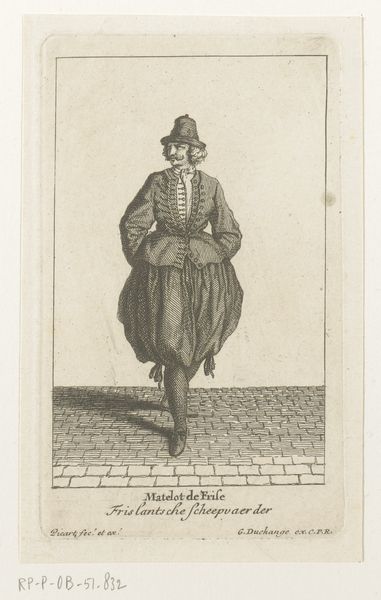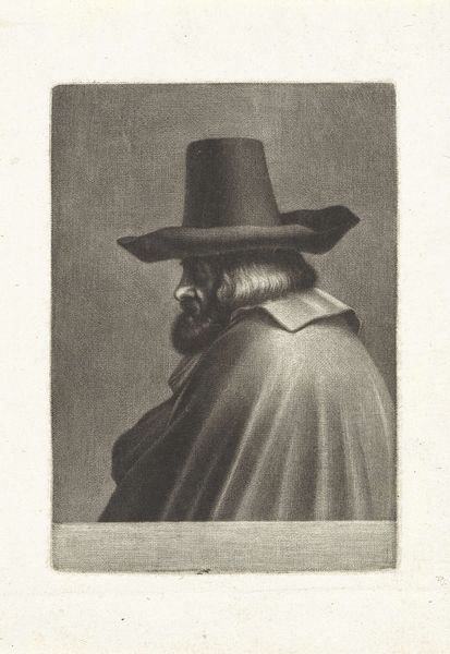 Curator: Here we have Rembrandt van Rijn’s etching, "Ephraim Bonus, Jewish Physician." Editor: It’s quite somber. The chiaroscuro Rembrandt is known for really lends the piece a reflective, almost melancholic quality. Curator: Absolutely. Rembrandt was deeply interested in portraying figures within their social context. Bonus was a prominent Sephardic physician in Amsterdam. Editor: The way he leans on the railing, gazing downward, it suggests a burden, perhaps the weight of knowledge or responsibility. The hat, the collar, they all convey status, yet there's a vulnerability in the eyes. Curator: It's a fascinating depiction, considering Amsterdam's relative tolerance at the time. Rembrandt often engaged with the complexities of identity. Editor: The image invites reflection on the enduring nature of symbolism in portraiture—how a pose, an article of clothing, all contribute to our understanding of a person, both then and now. Curator: Indeed, this work demonstrates the vital role art plays in fostering cultural understanding. Editor: It's a powerful glimpse into the past, filtered through Rembrandt's masterful understanding of light and shadow, both literal and metaphorical.
