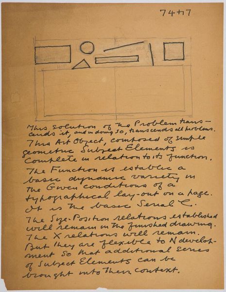 Editor: This is a fascinating page by Stuart Davis called "Art Theory Text with Diagrams." It seems to be a collection of handwritten notes. What strikes me is the combination of these abstract shapes up top with the more dense philosophical text below. What do you see in this piece? Curator: I see Davis grappling with control. He explores the idea of control as completeness, inclusion, and rational action. It's interesting to consider this in the context of his broader work. Davis was deeply interested in finding ways to merge abstract art with the cultural landscape of urban America and jazz, finding harmony in apparent chaos. This feels like an attempt to codify his approach. Can you see how his embrace of jazz music’s improvisational structure might push back against rigid definitions of "control?" Editor: That's an interesting point. It sounds like he's advocating for a more inclusive and dynamic definition of control, one that embraces change rather than suppresses it. Curator: Precisely! The piece encourages us to think about art as a process of negotiation, rather than a set of fixed rules, and that resonates with current social justice discourses, too.