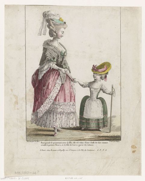 Editor: This is "L'Amour et les Graces Arrivant de Londres; Le Suprême Bon-Ton No. 24" by Adrien Pierre Godefroy, Le Jeune, created in 1815. It looks like a print. It’s interesting, almost satirical, in how it portrays these figures and their exaggerated fashions. What do you make of it? Curator: Immediately, I’m drawn to the material production and circulation of this image. It's not just an artistic statement; it's a commodity, a form of social commentary distributed via printmaking. Consider the labor involved: the artist, the engraver, the printer, the distributors. Who was the intended audience, and how does that affect its meaning? Editor: So you're saying its value comes from its means of production and how it circulated, rather than just its aesthetic qualities? Curator: Precisely! And look at what it depicts: fashion. Fashion is itself a system of material production and consumption, intimately tied to class and social status. The exaggerated style, the 'Supreme Bon-Ton,' suggests a critique of those obsessed with outward appearances. Editor: That makes sense. The title talks about "Love and Graces arriving from London." Were French and English relations important here? Curator: Absolutely! Consider the context. This was created after the Napoleonic Wars. The image reflects on shifting cultural power and the allure of foreign goods and trends. The artist comments on international commerce through depictions of clothing manufacture. Think about England’s booming textile mills at this time. This print shows consumption—French citizens desiring to acquire the objects and ideals of their British rivals. Editor: So it's not just a pretty picture; it’s wrapped up in economics and class struggles? Curator: Exactly! This print reveals how materials, production, and consumption intersect to create meaning. What initially appears as a lighthearted fashion plate is actually a complex commentary on post-Napoleonic society. Editor: Wow, I never would have looked at it that way! Thanks; that gives me a lot to think about.