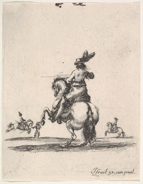 Curator: Let’s take a moment to appreciate “Ruiter op galopperend paard,” or “Rider on a Galloping Horse.” It's an engraving, attributed to Georg Philipp Rugendas, dating from between 1676 and 1742, and it resides here at the Rijksmuseum. Editor: Wow, what a wild ride! The way the horse seems to burst right out of the picture… almost like a dream. The rider has a kind of… distant, cold stare, doesn't he? Curator: Indeed. I think that coldness is revealing. Rugendas created many works focusing on battles and military life, so we have to read this within a broader framework of conflict. This image isn't just about a rider; it's part of a visual discourse of power and conquest. The subjugated figures under the horse, seemingly casualties, are particularly potent. How does their presence sit with you? Editor: It definitely darkens the initial impression. I first saw excitement, movement… then I noticed the fallen figures and it felt different. As if I’d stumbled into a nightmare unfolding in real-time. And suddenly the rider does look rather arrogant in his little hat. It gives me pause to see such power depicted so…bluntly. Almost proudly. Curator: That starkness is what many Baroque-era artists were trying to convey: the cost of glory. Remember the era – colonialism was rampant; exploration meant exploitation. These engravings can offer a chilling, yet vital dialogue on these dynamics. Notice also the lack of real environment– how the drama remains in the foregrounded actions, reducing the conflict to just the most fundamental parts. Editor: I do see that, it's interesting. Stripped down and raw, like a memory someone is fighting to forget. Thinking about today, where we grapple with monuments and historical narratives, this artwork does a brilliant job provoking those crucial, challenging conversations. There’s beauty, but unease. Curator: Exactly. Art forces us to confront these pasts, and our presents. Editor: Precisely! Now that’s a perspective that has stayed with me; a conversation piece for sure. Thanks for pointing it out.