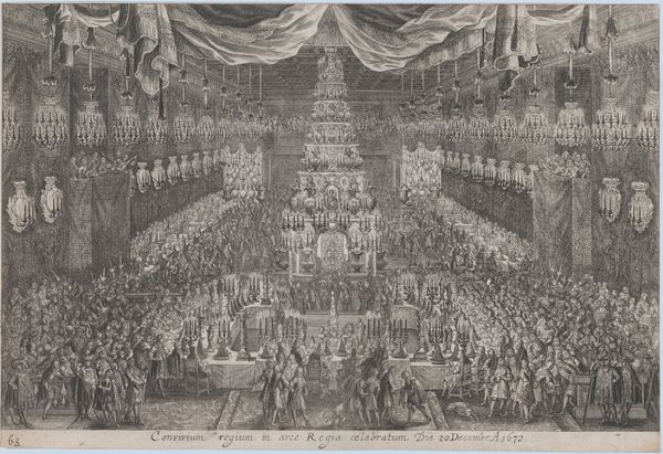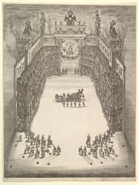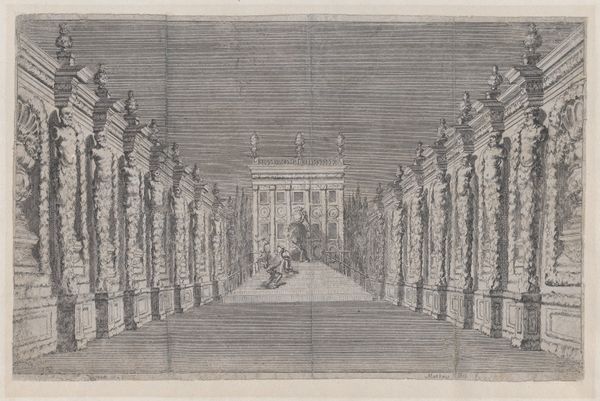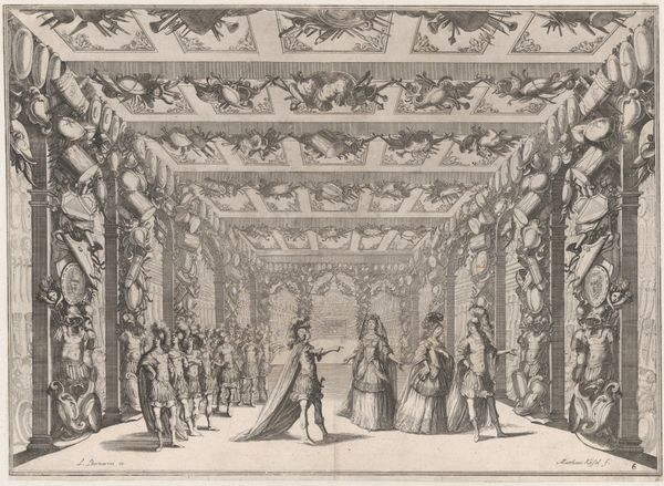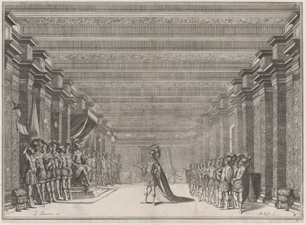 Mathäus Küsel made this print of a stage design called 'The Roman curia with guards in the anteroom; set design from 'Il Fuoco Eterno' using engraving. Here, Küsel represents an interior, likely for a performance in a courtly context in the Holy Roman Empire. We see the spatial politics of the court on display: guards flank the foreground while courtiers are seated in the distance. This print gives us access to the way space was organized and understood within the institution of the court. This is useful for understanding the politics of imagery. This design is rendered with close attention to detail and ornament. What can this tell us about the values of the court? The print demonstrates that art is contingent on social and institutional context. Historians consult prints and other documentary sources to better understand the cultural and political forces at play in the history of art and performance.
