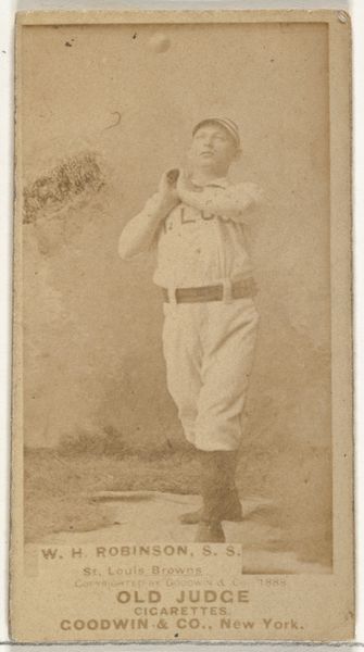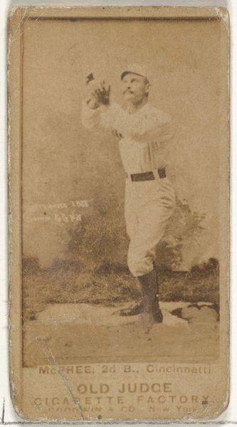 Curator: It's fascinating how time alters our perception. The sepia tones lend an air of quaint nostalgia to this image. Editor: Indeed. This is an albumen print dating from 1887 to 1890, part of the "Old Judge" series of baseball cards manufactured by Goodwin & Company. The subject here is John H. "Jack" Lynch, a player for the New York Metropolitans. Curator: The way he firmly grips that bat! Look at how the light etches the curve of the wood against the ground. Compositionally, the image is simple but effective—the player centered, a study in focused readiness. Editor: The commercial aspect is crucial here. These cards were originally included in cigarette packs. The Metropolitans team reflects the rising popularity of professional sports, strategically promoted to boost sales. The imagery normalizes tobacco use, subtly connecting it to vitality and American ideals of athleticism. Curator: Notice, too, the texture. The paper has aged, lending it a delicate quality. There's a subtle tonal range that defines form—a softened light caressing the subject. The background has almost faded, really pushing Lynch into the immediate foreground. Editor: Absolutely. The commercial purpose intersects with emerging photographic technologies, which both captured and constructed ideas of masculinity and athleticism at the time. The collectible nature also allowed for an expansion of social groups, gathering through baseball and the common possession of player portraits. Curator: Seeing the work in its physical form here at the Met, so many years removed from when the photo was originally printed for cigarette advertisement, does cause reflection. Editor: I agree; it’s a convergence of culture, sport, and marketing tactics memorialized through portraiture, leaving traces to analyze our own shifting ideals.