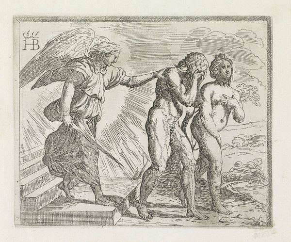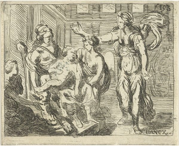 Orazio Borgianni created this print, "Noach offert aan God," sometime around the early 17th century. The composition is immediately striking, dominated by the central altar and the ascending smoke, directing our gaze upwards. Borgianni’s use of line is particularly noteworthy, creating texture and depth through dense cross-hatching. Notice the muscular figures, rendered with a dynamism that pulls them from the background, contrasting sharply with the stoic animals awaiting sacrifice. Structurally, the print uses the semiotic language of its time to communicate power and piety. The figures around the altar, each involved in the act of offering, emphasize a hierarchy through their positioning and action. Yet, Borgianni subtly destabilizes this order. The sacrifice, a deeply coded act, challenges conventional representations. How does this visual arrangement confront the viewer's expectations and established meanings? Consider how the composition engages with our understanding of space and representation, reminding us that art is not static. Rather, it’s a dynamic interplay of interpretation and historical context.