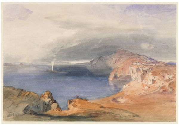 Editor: Here we have John William Inchbold's "Lugano (a Pillar in the Foreground)." I’m immediately drawn to the column on the left, it feels so…monumental compared to the figures. What do you see in this piece? Curator: The column acts as more than a framing device; it's a fragment of memory. The classical form hints at a grand past, viewed now through the soft lens of recollection and romantic yearning. How does that contrast make you feel? Editor: It’s a little melancholic, like something important is lost or fading away. I guess, like a dream of Italy from afar. Curator: Precisely! The pillar grounds us in that lost time, yet the delicate watercolor and distant mountains suggest an idealized, almost ethereal vision. It’s the pull of the past. Editor: That makes me see it completely differently, thank you! Curator: It’s the power of symbols, shaping our understanding.