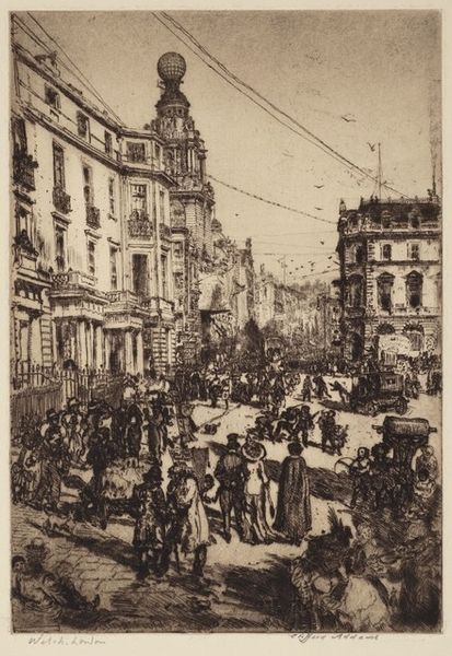 Johan Conrad Greive created this etching of the Weesperplein with a Fire Truck in the late 19th century. Greive was a Dutch artist working at a time when Amsterdam was undergoing rapid urban expansion and industrialization. This print freezes a moment of potential crisis amidst the everyday life of the city. The prominent depiction of the fire truck, pulled by horses and manned by uniformed figures, speaks to emerging civic infrastructures and the changing roles of public servants. Yet, it’s the figures on the periphery who capture my attention—the running man, the women carrying goods. Their stories are implied but unspoken, suggesting both the communal effort and the individual experiences within the city’s narrative. Greive’s choice of etching allows for intricate detail, drawing us into the scene, and creating a palpable sense of urgency and collective anxiety. The print doesn't just show a fire truck; it encapsulates the era's spirit—its progress, anxieties, and the human stories woven into the urban fabric.