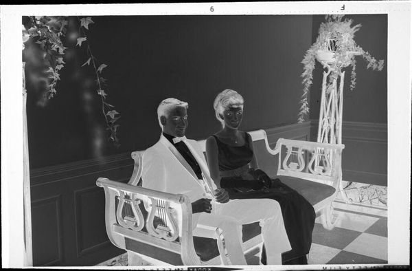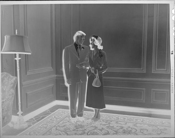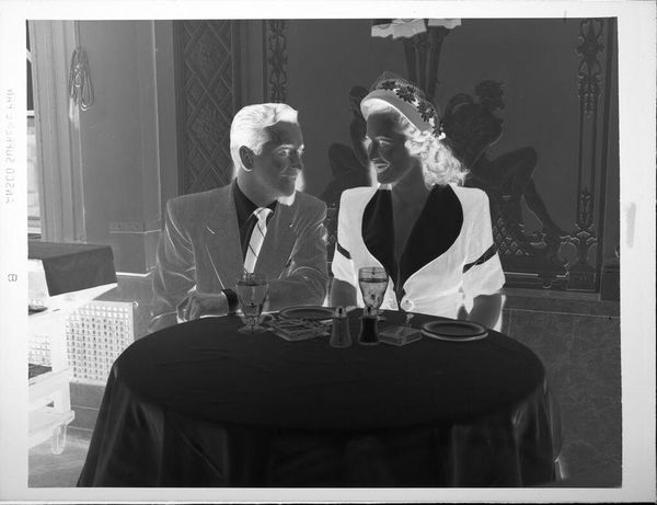 Curator: This intriguing silver gelatin print, approximately 4x5 inches, is by Peter James Studio and is titled "Untitled (man and woman sitting at table, smoking)." Editor: The composition is striking, almost cinematic, and the high contrast creates a very dramatic mood. Curator: It's a classic scene, isn't it? A man and woman, caught in a shared moment over cigarettes. The smoke itself becomes symbolic of ephemeral connections, of shared secrets and unspoken desires. Editor: True, and the table acts as a sort of stage, framed by these figures and the rather ornate decor in the background. It's all lines and curves—the soft light on their faces, then the sharp angles of the suits. Curator: The smoking gesture carries weight, doesn't it? It signifies leisure, but also tension, perhaps even a veiled rebellion. I wonder what narrative the artist intended to evoke. Editor: It’s compelling. The image creates a strong sense of presence and invites us to decode the relationships implied by its formal elements. Curator: Indeed, seeing this photograph makes you feel as though you are there, a voyeur to their intimate moment. Editor: I agree. It's a testament to how much meaning can be conveyed through careful attention to form and shadow.