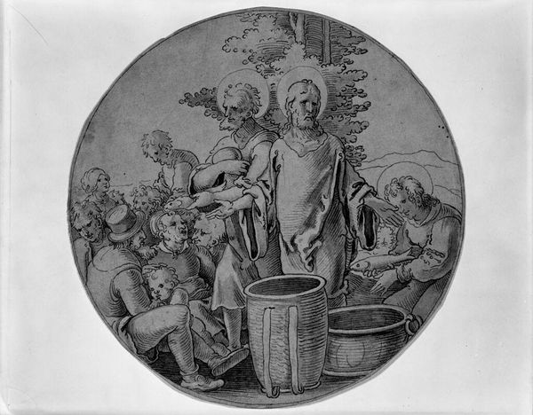 Curator: This intense image, "Christ Spat upon and Mocked," is by an anonymous artist. The work, rendered in ink, explores themes of power, humiliation, and the body. Editor: The overall mood of this work strikes me as claustrophobic; the composition has the figures crammed within the small, round frame. Curator: Indeed. The artist powerfully depicts the abject cruelty inflicted upon Christ, surrounded by figures embodying societal forces, their aggression underscored by historical and religious contexts. Editor: This piece makes me think of the ways religious narratives have been used to justify oppression, and how art can bring these painful power dynamics to life. Curator: Precisely. The facelessness of the oppressors speaks volumes about the systemic nature of this dehumanization. Editor: Absolutely, it’s that anonymity that haunts me. Even though difficult, this image provides insight into these historical and contemporary injustices.
