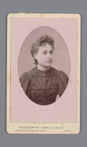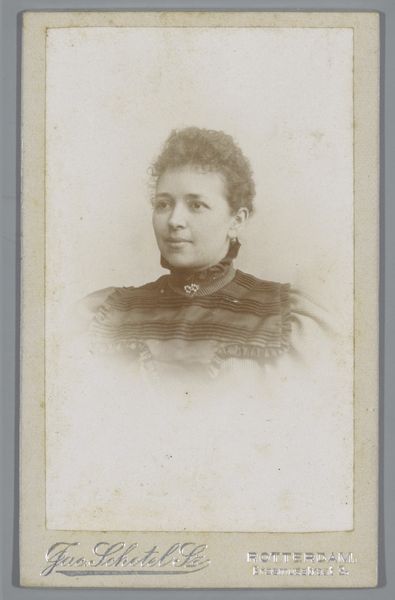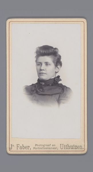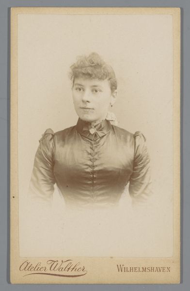 Curator: Standing before us is a work by Machiel Hendricus Laddé, known as "Portrait of an Unknown Woman." This gelatin-silver print likely dates from around 1892 to 1906. What are your initial thoughts, Editor? Editor: She seems a little trapped. It's that tight collar, maybe, but also the faded edges—it's like looking at a ghost peering from a misty window. I wonder about her life; she’s almost haunting, even with that very proper, stern expression. Curator: Studio photography during this period had its own conventions and constraints. This format, called a "cabinet card," became incredibly popular in the late 19th century. Note how Laddé meticulously posed his sitter, emphasizing societal ideals of beauty and status. Editor: Definitely, those puffed sleeves, while elegant, feel a bit like arm cuffs, don't they? It feels very contrived, like this image of perfection she's forced to convey in front of a camera. I bet there were layers underneath the controlled pose that are not immediately obvious. Curator: Indeed. Photographic portraits such as this offered individuals a means to shape their public persona. Photography democratized image-making and this transformed social visibility. Photography's ability to document reality provided a way to negotiate social expectations. Editor: Still, looking at it, I keep thinking about all those hidden narratives lurking underneath. Did she pick out this dress herself? Was she nervous? Annoyed? All these stories get reduced into one controlled, static moment...it's like pressing flowers, isn't it? Curator: That's a lovely comparison. We must consider how these visual narratives shaped not only individual identities but broader perceptions during a rapidly changing society. Her story exists also in the hands of the author and the social convention around the subject, photography and "portraits". Editor: That's why this image resonates—it makes you contemplate all the untold stories we leave behind, sealed up in albums and forgotten drawers. She almost asks us, doesn't she, to imagine a life for her beyond this silvered rectangle. Curator: Ultimately, contemplating the historical significance and aesthetic impact, the photograph stands as a potent reminder of both visibility and invisibility in an era defined by the burgeoning possibilities of photographic representation. Editor: Exactly. Maybe what we see as restriction also became a kind of preservation—a visual echo of lives otherwise vanished completely. Powerful, haunting, a tiny square holding big stories.