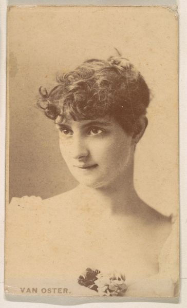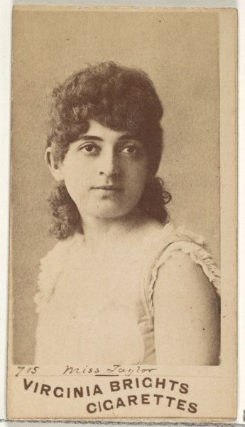Curator: At the Metropolitan Museum of Art, we have “Josie Sadler, from the Actors and Actresses series” created between 1885 and 1891 by Allen & Ginter as an albumen print. Editor: It's a delicate, almost ethereal portrait, isn’t it? The soft gradations of tone, the way the light catches her hair, creates such a gentle focus. Curator: These small albumen prints, issued as trade cards, offer insight into the cultural fascination with celebrity and consumption. The portraits, distributed within cigarette packs, transformed popular actors into commodities themselves. Editor: The composition directs my eye. I'm struck by how her gaze leads just off to the side. There is a compositional balance there, between what she sees and what we are left to wonder about. Curator: The Virginia Brights Cigarettes' name stamped below is central. It suggests a shift in how actresses were marketed—linking their image with brand identity to increase cigarette sales among a burgeoning consumer culture. Sadler herself, however, is somewhat lost to history beyond the stage and this series of images. Editor: Interesting. So much context can surround the essence of the work. Looking past that, the artistry seems quite considered. It is subtle in its staging and the control over light and tone is handled masterfully. Curator: It demonstrates the commercial strategy that commodified artistic representation, essentially collapsing the distance between spectator and performer and linking identity to the market. Editor: Absolutely, I follow. But without knowing this, the artwork still speaks to our perception of beauty. There’s a harmony to it that exists independent of the historical purpose. Curator: It is a document from an emerging time, linking early advertising to entertainment culture through mediums we often forget. Editor: A compelling discussion as ever; it reminds me to look both intently and broadly at any given artwork to see its multiple facets.