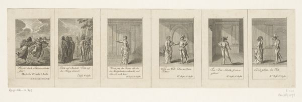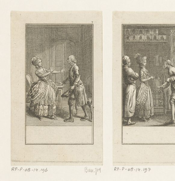 Curator: Here we have an engraving by Daniel Nikolaus Chodowiecki, titled "Kaberdar koopt de manchetknopen van de jongeman", made around 1790. It's currently held in the Rijksmuseum collection. Editor: Right off the bat, I’m struck by how…orderly it is. Two separate scenes meticulously rendered with a lightness of touch – almost like a theatrical stage set for a miniature drama. There's something very staged about it all, despite being a humble print. Curator: Chodowiecki was a master of capturing social mores in print. The paired scenes, accompanied by text, suggests a narrative, perhaps part of a larger series, much like an early graphic novel. The scenes capture something very common in 18th-century moral prints – stories that guide and explain conduct and beliefs to a largely illiterate audience through easily understood visual language. Editor: Ah, that makes sense! I was wondering about the juxtaposition. I thought it might represent before and after or different possible outcomes to a single negotiation. Given your reading of the imagery, what do the cuff links represent within this moral code? Curator: Cufflinks here, and more broadly clothing, and accessories can be interpreted as more than just adornment. In this story, these could easily symbolize status, maturity, or a changing role in society, and they are not offered, but are rather purchased under contract or obligation. The "kindliche Liebe", childish love, might hint that the young man here gains experience only via his monetary trade. Editor: Yes, I suppose accessories gain new and nuanced significance depending on the historical period, it gives me plenty to ponder. What I enjoy here are the clear and precise gestures of each figure and how that speaks across centuries of shared expression. It invites my curiosity, even if the moral codes are antiquated now. Curator: Agreed. These precise prints offered more than entertainment; they preserved cultural memory. As we study prints such as this, we start to understand more about this slice of society and its own particular set of cultural continuity and anxieties. Editor: Well, I'm leaving this viewing with some newfound respect for cufflinks and a craving for a time-travel adventure to an 18th-century stage production!