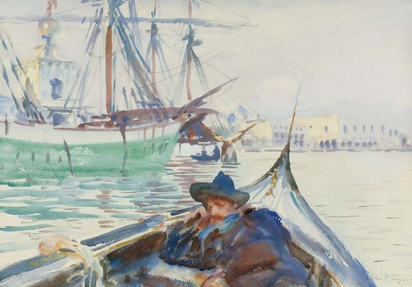 Editor: This is John Singer Sargent’s “Schooner, Catherine, Somesville, Maine,” created around 1925 using watercolor. I'm struck by the contrast between the stillness of the boats at harbor and the implied motion and grandeur of these vessels out at sea. What do you see in this piece? Curator: The ship is a powerful signifier, isn't it? It speaks to the cultural memory of journeys, of maritime heritage. The Schooner suggests a specific type of seafaring history, linked perhaps to trade, exploration. Do you feel any weight of history when looking at the details? Editor: I guess so. It also feels so intimate, and the close viewpoint brings a sense of quiet observation. It almost feels personal. Curator: The way the water reflects the ship, mirroring its form, almost suggests a double reading of the self. Ships have been seen throughout art as stand-ins for a symbolic body embarking on a voyage, like a soul finding its place, navigating challenges... Don’t you agree? Editor: That’s not how I would think about it initially, but I think I understand your interpretation. Are the boats maybe hinting at our journeys through life? Curator: Exactly. Sargent subtly imbues this scene with multiple layers of meaning. And it really invites us to contemplate our individual and shared past. It invites contemplation on journeys—historical, personal and metaphorical. Editor: It’s fascinating how much meaning a simple watercolor of a boat can contain. I'll never see boats the same way. Curator: And I’m left pondering Sargent's own journey as an artist, always navigating between representation and symbol. Art invites these kinds of reflections, doesn’t it?