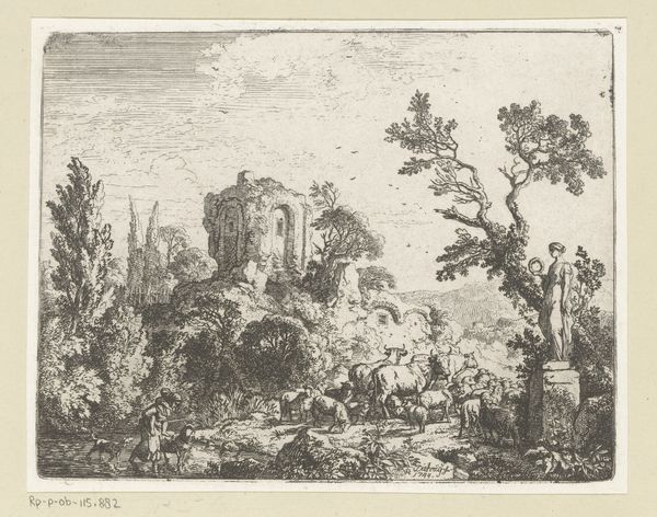 Curator: This print, "Frontispiece- Vedute di Roma", is an etching and engraving by Giovanni Battista Piranesi, created around the 18th century. Its swirling details immediately give a sense of…drama. Editor: Drama, absolutely, but also something of a fever dream! Look at the textures here. The hatching and cross-hatching build a tangible, almost chaotic surface. You can practically feel the density of the ink. Curator: Yes, that’s crucial to observe! The intricate network of lines, the tonal gradations—they articulate Piranesi’s exploration of form. Note how he balances the grandiose ruins with almost pastoral vignettes. Semiotically, there is such tension… Editor: I'm especially drawn to how Piranesi renders the ruin's physicality. Imagine the labour behind carving and transporting these stones. Then consider how time, environmental factors, and potential human activity altered the raw material of this city! Etching this vision involves its own manual process, mirroring, to some extent, the labor involved in building Rome itself. Curator: Precisely. And through Piranesi's Baroque aesthetic we recognize that Rome's architectural grandeur transforms beyond literal representation to comment on enduring imperial structures through sublime technique. The dramatic chiaroscuro creates symbolic tension in classical form, wouldn’t you agree? Editor: The composition does so much work here in framing the idea of architectural production and obsolescence. The choice to highlight how labour and decay sculpt raw material into both construction and deconstruction… Curator: True, Piranesi presents a vision where temporal dynamics are architecturally inscribed within the Eternal City. Editor: These shifting impressions are quite telling. The meticulous craft belies the romanticised decay of a powerful structure, offering compelling questions for its audience in terms of function and form, then and now. Curator: Thank you for contributing these fascinating insights. Considering how light and shadows create dynamic tensions is especially memorable when approaching Piranesi’s print today. Editor: My pleasure. Examining its material components offers yet another rewarding lens into this enduring cityscape.