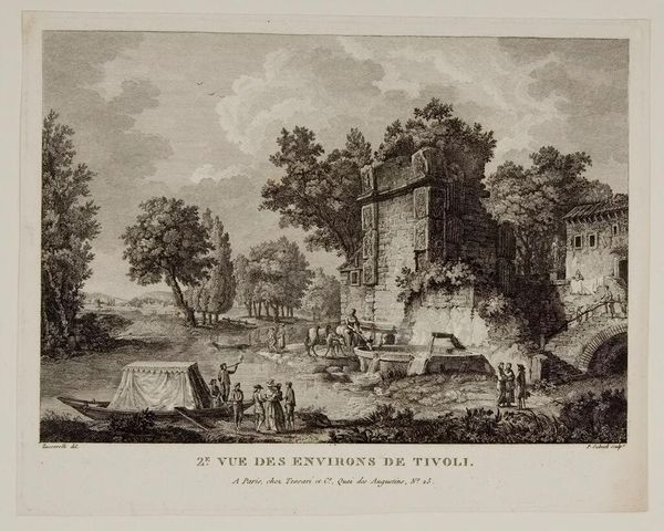 Curator: Let's consider Jean-Baptiste-Claude Chatelain's Landscape with a Tower and a Canal. It's held at the Harvard Art Museums. Editor: It feels incredibly staged, almost theatrical. Look at how that tower dominates the scene. What was its real function, and why is it so prominent in this composition? Curator: Well, Chatelain was prolific as a designer of landscapes for prints. It's an etching, so we should consider the labor involved in its creation. The paper and the ink, the systems of patronage that supported Chatelain’s artistic endeavors. Editor: Absolutely. We see echoes of classical landscape traditions, but what's the social commentary here? Is it a romanticized view of rural life, or perhaps a commentary on land ownership and the power structures represented by that tower? Curator: I see how Chatelain uses line and tone to create depth. The very act of etching, the repetitive actions involved, speak to a larger system of artistic production. Editor: It certainly invites discussion about the construction of idyllic landscapes and their role in shaping perceptions of nature. Curator: Thinking about the materials truly enhances how I see the finished print. Editor: And for me, considering its place in the history of landscape representation brings a whole new understanding of Chatelain’s choices.