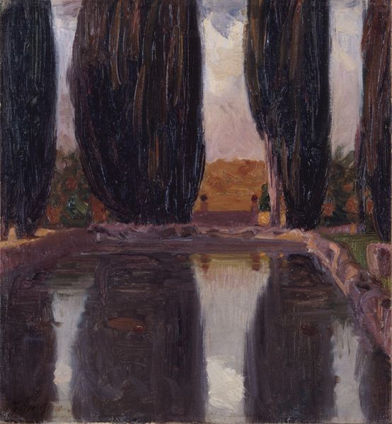 Curator: Looking at Egon Schiele’s "Landschaftsstudie; Hirschbergen – Böhmerwald" from 1908, I’m immediately drawn to how starkly simplified everything is. Editor: Simplified, but intensely somber. It feels less like a depiction of the landscape and more like a heavy, almost melancholic mood hanging over it, conveyed through those dominant washes of deep blues and muted greens. What's particularly striking is the visible texture of the watercolour paper itself. Curator: The simplification certainly adds to the emotive power. He was very interested in externalising interiority onto the landscape, projecting feelings onto it. I wonder, considering Schiele’s German Expressionist lens, what sort of landscape symbolism you perceive at work? Editor: I see a raw, unfiltered presentation. Schiele's bold use of watercolour here is quite revealing. There is something really tactile to consider in that loose, almost careless application; he doesn’t hide the process. It gives me a sense of his engagement with his medium—a rather gestural recording of the world around him, not an idealized recreation. It feels very immediate and human. Curator: Exactly. The materiality communicates a sensory experience. Schiele was less interested in pure visual fidelity. He transforms nature into a visual cipher reflecting human psychology, specifically the disquiet and anxiety of his time. Look at the very angular lines creating harsh divides. What appears to be a bucolic setting is now a site of angst. Editor: Yes, and even the colours play a part. These aren’t natural greens or blues; they're emotionally heightened representations. Given Schiele's socio-economic context and personal struggles during that period, his approach of "distorting" conventional representation of natural scenes is interesting when considering materiality as another level of messaging and the way he made paintings under those circumstances. It allows him to tap into his emotion at the core. Curator: Precisely! And seeing the cultural memory encoded through these intense visual and gestural markings, his landscape becomes more than just a geographical location. Editor: I see Schiele is also using his materials here to communicate something intensely personal about himself within his own particular time. A landscape rendered not as picturesque scenery but as an expressive medium in its own right. Curator: In sum, the piece prompts reflections about nature and feelings in a broader historical context. Editor: For me, it underlines how material can communicate cultural contexts, becoming a sensory diary to interpret from its visual presentation and historical setting.