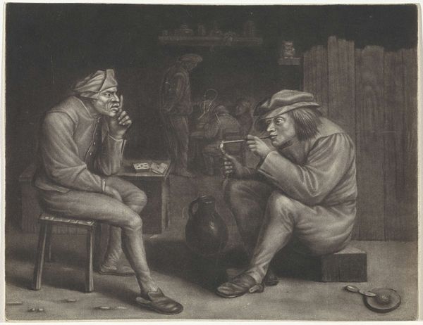 Curator: Here we have Richard Earlom’s etching and engraving, “The Story Tellers,” likely completed around 1768 and now residing here at the Art Institute of Chicago. Editor: My first thought is of quiet desperation. Despite the seeming conviviality around that table, there's an undeniable gloom clinging to the scene. The exaggerated features feel less humorous and more…warning signs of societal ills, perhaps. Curator: Indeed, Earlom's technical skill, the dramatic chiaroscuro and precisely rendered details, elevates what might be mere caricature to a study of types. Consider the almost sculptural rendering of each face. Each wrinkle, each puff of smoke defines not just an individual but speaks to a specific social milieu. Editor: But isn't it impossible to divorce those individual, expressive faces from the political currents of the time? Given the burgeoning socio-economic inequality in 18th century Europe, it's difficult to see these "story tellers" without considering questions of power, privilege, and exclusion. Who is included in the joke, and at whose expense? Curator: A crucial point, of course, and to note the composition reinforces a kind of stratified viewing. The figures closest appear the most clearly and decline the further away, ending with that obscured, shadowed figure at the doorway. It is very much organized to elicit careful assessment of class and, ultimately, of status. Editor: And consider how the medium itself speaks to accessibility! A print like this would have allowed for much broader circulation and therefore had potentially significant power as a commentary. Earlom doesn’t shy away from critiquing social performance through pointed, almost cruel caricature, right? Curator: “Cruel,” perhaps, is one way to frame Earlom’s sharp wit, and yet, there is a precise structural logic. Observe, too, how his meticulous detail serves to highlight particular attributes in ways that, whether read critically or satirically, reveals underlying character traits in a very direct way. Editor: Which prompts one to think of Brechtian alienation, or perhaps a dark take on humanist ideals. Considering Earlom’s position within his historical framework reminds us that his techniques themselves aren't neutral. What does it mean to turn ordinary people into grotesque types for wider consumption? It's not just observation, it's also a type of violence. Curator: Regardless, what Earlom has delivered through form, line, and composition is, if nothing else, the anatomy of observation, itself—both a reflection of, and perhaps a guide toward, how we interpret society's reflection within art. Editor: I would add to that it holds space to evaluate how artistic representations influence not only our perception of art itself but also that of our fellow citizens, compelling viewers to investigate these dynamics continually and critically.
