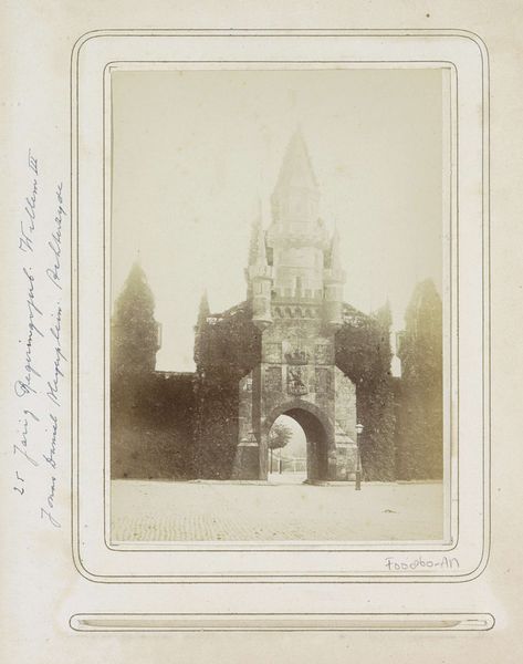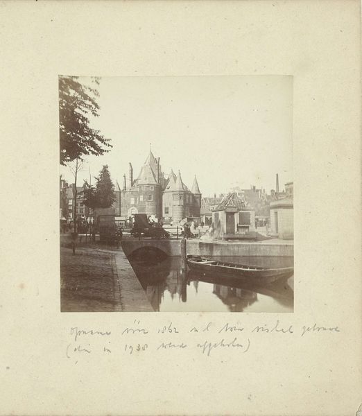Curator: Pieter Oosterhuis created this gelatin silver print around 1867. It’s entitled "Gezicht op het Waaggebouw aan de Nieuwmarkt in Amsterdam"—or, a view of the weighing house. Editor: My first thought is how somber it feels. The pale tones, the formal composition, it’s a world away from a tourist snapshot. Curator: The stark realism really anchors it in its time. We see the textures of the building, the cobbles, feel the weight of history. Photography was still relatively new; this reflects the shift to capturing an objective record, less about idealization, and more about the facts. Editor: I’m interested in how Oosterhuis composes the image, balancing architectural details against the flatness of the ground. Look at the rhythm of the fence posts marching to the side; or how the rooflines fight to dominate the image. This arrangement seems designed to draw our eyes to specific areas, even despite its “objectivity.” Curator: And consider what's happening around this weighing house. It had transitioned from a city gate, to a guild hall, and now, in Oosterhuis's time, served various purposes like fire watch and anatomical theatre. Its presence here is as a backdrop for the daily economic realities of the market. Editor: So, the building becomes a stage. The light seems to unify the structure. The angle helps, too, suggesting depth and complexity that contrasts with its surroundings. Do you find any particular emotion or message comes through most strongly here? Curator: I see the photo documenting a transitional space. It's rooted in its materials and processes of both its subject as architecture and the image as document, it really transcends mere reproduction and enters into the realm of artistic statement. Editor: Absolutely. By examining its form and material qualities, this print gives us both a visual record of Amsterdam and a feeling for the time and processes behind image making in that era.
