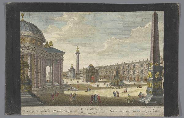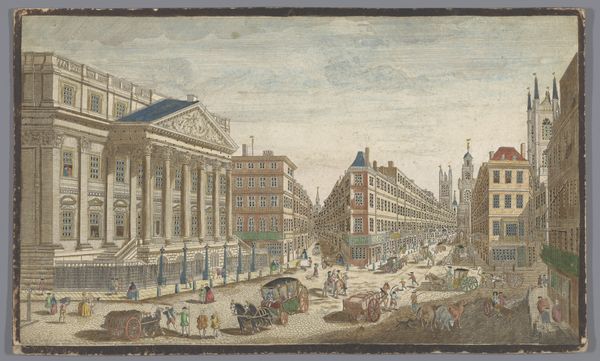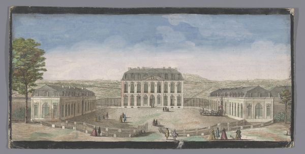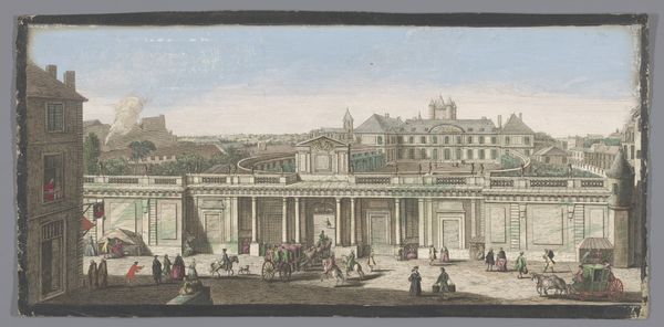 Curator: The opulence just shouts, doesn't it? I'm instantly drawn to the light, almost shimmering quality of the watercolor. Editor: Absolutely. Let’s orient our listeners. This piece, “Gezicht op Hôôtel de Soubise te Parijs," which translates to "View of the Hôtel de Soubise in Paris,” is an 18th-century work currently residing at the Rijksmuseum. Its origins are unknown, making the question of who created it all the more intriguing. We know it employs a mixture of media: drawing, colored pencil, watercolor, and print techniques all combined. It’s pure Rococo, a stage set for aristocracy. Curator: Yes! The colours are so light, like spun sugar. And that theatrical quality… the way the building is presented, almost like a grand reveal. The artist—even though we don't know who it is—has managed to capture a fleeting moment of powdered-wig elegance, wouldn't you agree? Editor: Elegance built upon structures of deep inequality. That's what strikes me most. The meticulous rendering of the Hôtel de Soubise is a celebration of power and privilege. The architectural details, highlighted by those delicate colors, showcase the grandeur enjoyed by a select few during the era, a vision upheld and made possible through labor rendered invisible in plain sight, outside of the picture's border. Curator: True, it’s easy to get lost in the aesthetic pleasure without thinking about the wider context. It’s like a perfectly iced cake with a slightly bitter aftertaste. I mean, I love a good cityscape and here you see everyday activities amidst the grandeur—carriages arriving, people strolling. There’s even a little dog. It almost domesticates the monumental, though unsuccessfully. Editor: Exactly. The seemingly casual inclusion of everyday life doesn’t quite neutralize the statement of power embodied in the architecture. It's Rococo propaganda. I find it a testament to the importance of continuously critiquing not just the images, but the values and the structures they depict and endorse. It shows how visual media worked to define the sociopolitical landscape. Curator: Well, I’ll never look at powdered wigs in the same way again! But I'm still utterly charmed by its pastel prettiness, despite everything. The skill is undeniable. Editor: And perhaps that is its enduring power—to charm, even as we recognize the historical and social realities embedded within its delicate lines. Thank you for helping me consider that.