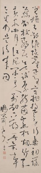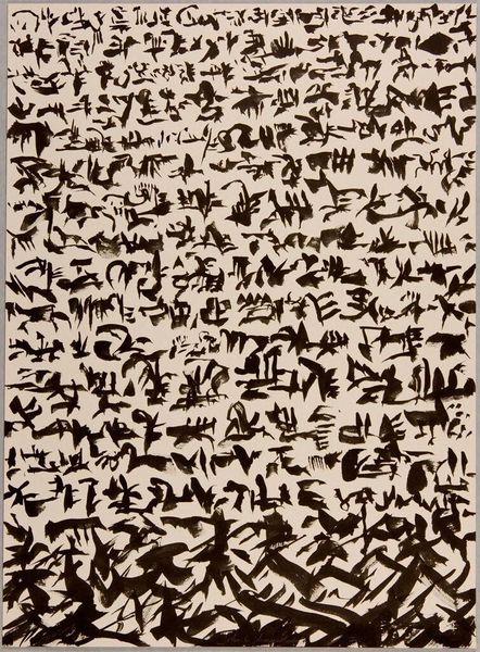This is an illustration by Abidin Dino, titled Saman Sarısı, composed of dynamic black marks on a muted background. The spontaneous yet rhythmic arrangement of shapes evokes a sense of movement and energy. The composition is structured around a loose, circular form at the top, from which the marks cascade downwards. Look at how the stark contrast between the black ink and the off-white paper creates a visually arresting effect. Dino's mark-making reflects a broader artistic interest in gestural abstraction, where the act of creation becomes as important as the final image. These marks can be interpreted as a semiotic system, where each stroke functions as a signifier. They don't represent a specific object but rather convey emotions and ideas. The overall effect is one of controlled chaos, where the balance between spontaneity and structure invites ongoing interpretation, challenging viewers to find their own meaning within its forms.