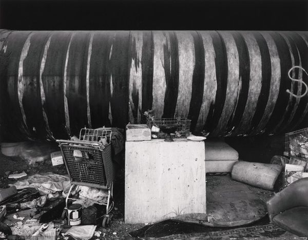 Editor: Piet Zwart’s “Untitled” photograph, taken around 1930, presents an intriguing image of what seems to be an oversized spool of cable. The black and white print possesses an industrial severity, but there's also something organic juxtaposed against the mechanical. How do you interpret this work, considering its blend of textures and forms? Curator: The pairing is critical, wouldn’t you agree? It's like Zwart wants us to feel the pulse of progress, symbolized by that massive spool, yet he anchors it with something rudimentary, primal almost. Consider the symbolic weight of line: the cable promises connection, power, yet the ragged 'tree' root—suggests a return to basic, foundational things. What sort of psychological contrast does this evoke? Editor: It creates a sense of tension, a visual push and pull between the industrial and the natural. It feels very modern, perhaps a little uneasy. Is there anything more to it than that contrast, though? Curator: It might evoke a certain Dutch practicality and even the clean aesthetic championed by the De Stijl movement, a quest for harmony, yet the messy organic element challenges this ideal. How might this collision of ideas affect our understanding of “modernity” itself? Consider its potential disruption of memory: do these forms hold echoes of something? Editor: Hmm, so perhaps it's not just about progress, but about remembering where that progress comes from. It's as if Zwart is subtly questioning the narrative. Curator: Precisely. He transforms ordinary subjects to reflect on the relationship between nature, industry and representation, which might have some resonance in a modern context as well. Editor: This makes me see the photograph in a completely new light. Thanks for opening up those pathways of interpretation. Curator: Indeed. The weight of symbols often lies in where they lead us, wouldn’t you say? A reminder to engage critically with even the most straightforward looking forms.