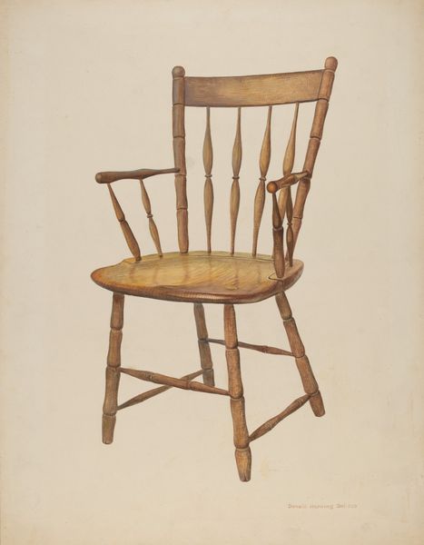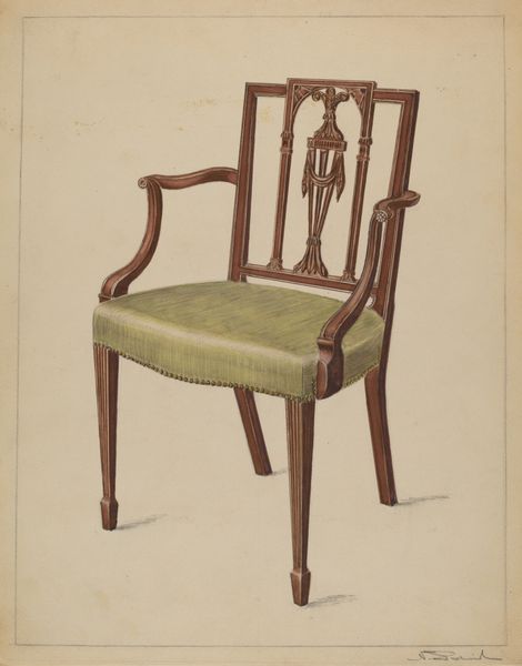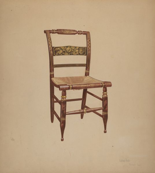 Curator: So, what leaps out at you about this work, Editor? It's a watercolor and pencil drawing on paper by Bernard Gussow, dating from around 1936. He titled it "Side Chair." Editor: Immediately, a sense of calm, Curator. It's so meticulously rendered, it's almost reverential. I feel like it could sit comfortably in a Vermeer interior. There’s a beautiful precision to it. Curator: Precision is an apt term. Gussow’s use of line to define form is exceptionally clear, almost architectural in its exactitude. Consider how the watercolor is employed. See how the artist evokes volume, lending subtle tonal variations to the wooden frame of the chair. Editor: And how the woven seat contrasts texturally with the hard wood. The linear quality, though, feels almost dreamlike. Maybe it's the soft, muted tones, but it gives off a hushed, nostalgic vibe, as if conjured from memory. I imagine myself perched on it on a stifling hot day on the veranda. Curator: Interesting. This "dreamlike" quality you're referring to arises, perhaps, from the stylized rendering of a mundane object, elevating it, via formalism, to something beyond mere representation. Its compositional structure adheres to certain conventional guidelines, yet it maintains a subjective, abstracted representation. Editor: I agree about its abstract qualities. Even though it’s clearly representational, there is something almost spiritual. The symmetry, the balanced lines – it borders on the iconic, doesn’t it? A timeless design reduced to its beautiful essence. Curator: Indeed, this drawing achieves that equilibrium precisely through Gussow's masterful handling of formal elements—his strategic distribution of line, color, and texture all contribute to this artwork's resonance. Editor: For me, its evocative simplicity, coupled with those confident, decisive lines, makes this drawing a treasure. There is much conveyed with only a few strokes, and the mood created really takes the drawing out of pure function to someplace rather ethereal. Curator: I concur that it stands as a testament to Gussow's abilities.