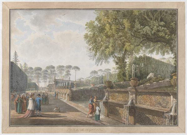 Giovanni Volpato’s ‘Villa Borghese’ is rendered in delicate watercolor and ink, presenting a panorama that balances architectural precision with the softness of the surrounding landscape. The composition is structured by a clear division between the formal, structured facade of the villa on the left, and the more organic, free-flowing garden on the right. Volpato uses line and wash to delineate forms, creating a sense of depth and space. The facade is detailed with linear precision, suggesting a rational order, while the garden is evoked with looser strokes that imply movement and life. This interplay highlights a tension between the man-made and the natural. The subdued palette enhances the atmospheric quality of the scene, lending it a nostalgic, almost dreamlike quality. Volpato's treatment of light and shadow across the architecture and landscape serves not only to define form but also to unify these disparate elements, suggesting an idealized harmony between culture and nature.