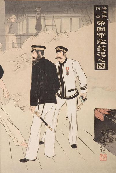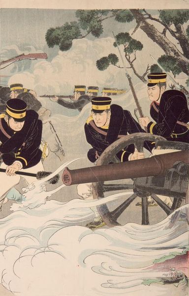 This woodblock print by Kobayashi Kiyochika depicts Lieutenant-General Yamaji leading the Japanese Second Army during its landing on the Jinzhou Peninsula. It shows the general as a figure of authority surrounded by his troops. The image creates meaning through visual codes and cultural references. The artist was working in Japan during the Meiji period, a time of rapid modernization and militarization. The print depicts a scene from the First Sino-Japanese War in 1894-95, a conflict that marked Japan's emergence as a major military power in East Asia. The depiction of military leaders was used as propaganda to promote nationalism and militarism. Woodblock prints were used to disseminate images of war heroes and military victories to a wide audience. Analysing woodblock prints requires reference to diverse archival resources such as military records, government publications, and popular media. This helps us to understand the image in its original social and institutional context.