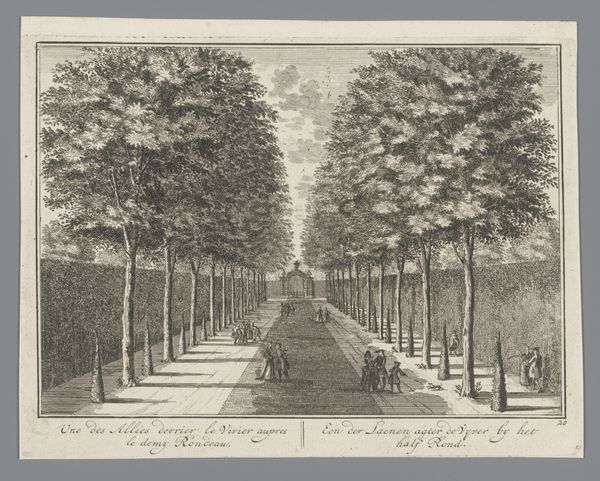 Curator: Welcome! We are standing before a fascinating engraving titled "Gezicht in de tuin van Slot Zeist," or "View in the Garden of Zeist Castle." It was created sometime between 1682 and 1726 by Daniël Stopendaal, during the Dutch Golden Age. Editor: It feels meticulously structured. There’s a rigid formality to the landscape, with high hedges that look like walls. Even the water seems engineered. Curator: Precisely. The image demonstrates the Baroque fascination with order and control, very en vogue for stately homes of that era. These weren’t just gardens; they were status symbols reflecting the owners' power. We have a canal and several people strolling around or gathered in groups along it. Do you get a sense of how garden designs became an expression of political philosophy at the time? Editor: Absolutely, it is as if to say: "Look at what I have built!" The architecture in this design asserts control, both politically and socially, over the environment. Curator: Indeed. Note how Stopendaal uses perspective. The eye is drawn deep into the garden, subtly reinforcing that sense of controlled space and perhaps implying a sense of dominion over the natural world and whoever occupies the area within. This location at Slot Zeist might also reveal class dimensions within 17th-century Dutch society. Who are these figures? Is Stopendaal suggesting these figures represent the noble class that can access spaces unavailable for most Dutch people during this era? Editor: Exactly, I wonder about accessibility and labor. Who designed these meticulously geometric garden designs? I assume the hedges and other flora were the daily work of paid laborers rather than the residents of the estate, perhaps creating another dimension of coloniality at play in its architecture. And thinking through an accessibility lens today, does that also become a statement that asks: “Who gets to decide what nature looks like and feels like, today?” Curator: The rigid formalism is interesting within its historical moment, yes. Gardens like these demonstrated an elite and noble group of Dutch citizens who sought to show themselves as progressive by keeping pace with the aesthetics of other wealthy socialites of Baroque Europe, yes. Thank you. Editor: A garden is never just a garden! This really reveals how deeply art is intertwined with social hierarchies.