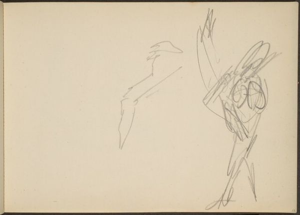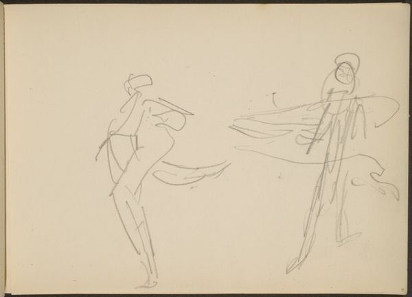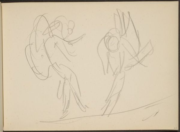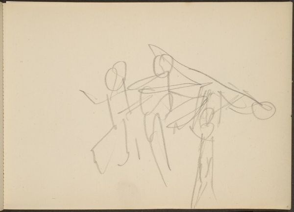 Curator: This evocative pencil drawing, titled "Drei Figuren, wohl Tänzer" or "Three Figures, probably Dancers," is by Max Beckmann. Editor: The sketchiness is immediately striking. The figures feel like they are barely there, quickly captured gestures full of latent energy. Is there an apocalyptic mood at work here, considering Beckmann's experiences of war and his German Expressionist associations? Curator: Beckmann certainly explored trauma in his work. His engagement with World War I is vital for interpreting how anxieties shaped the formal techniques in the arts. It seems these are notes toward future, more complex compositions. Editor: The very nature of "rough sketching" creates a raw quality—not trying to show an exact replication. The symbolism of three figures in dance – are they celebratory or menacing? Is Beckmann possibly portraying The Three Graces? The visual culture across traditions informs modern symbol-making and challenges traditional depictions of feminine grace in the 20th Century. Curator: This drawing marks a crucial moment, situated amidst the changing roles of museums and institutions actively involved in art creation and cultural representation in Weimar Germany, the cultural and political changes of Germany would also give a background to understanding this theme in Max Beckmann’s portfolio. Editor: I like that connection between this fragile sketch, its place, and the time. Each line now whispers a story beyond the dancing figures themselves. Curator: This artwork illustrates the shifting aesthetics around trauma during Beckmann’s expressionistic phase, showing its historical effects of societal transformation in postwar Germany. Editor: Indeed, contemplating this sketch lets me think more about this moment in time and Beckmann’s vision in this period.