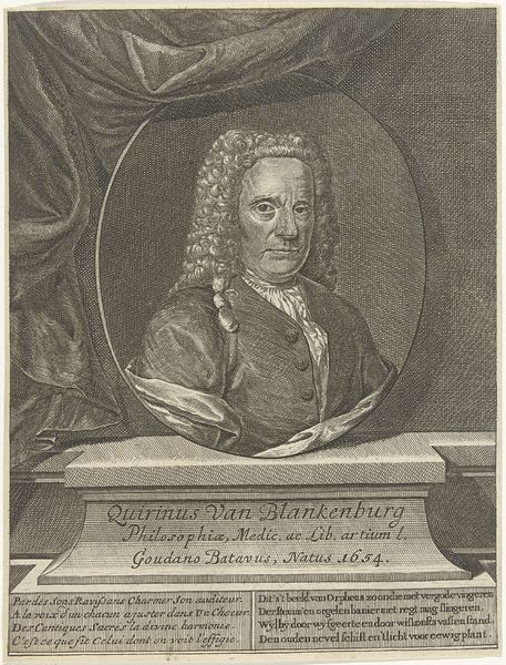 Curator: Standing before us, we have Jacob Houbraken's "Portret van Lambert Bidloo," an engraving dating roughly from 1708 to 1724. It’s part of the Rijksmuseum's collection, showcasing the Baroque style so prevalent during the Dutch Golden Age. Editor: My initial feeling is one of contained power. The meticulous detail of the engraving highlights Bidloo's individual features and intricate attire, projecting an air of intellect and social standing that definitely commands attention. Curator: Absolutely. Consider the socio-political climate of the time. Bidloo was a prominent figure – a physician, botanist, poet, and playwright. How does Houbraken's portrayal reinforce or perhaps challenge those established roles? Editor: Well, the formal presentation undoubtedly serves the function of reinforcing the status quo. Look at how his luxurious wig signifies access to elite circles. However, his hand rests upon what appears to be a text of sorts— suggesting his investment in matters of scholarly importance and artistic expression, maybe destabilizing a sense of fixed and immutable societal hierarchy. It evokes an interesting negotiation. Curator: I agree. The choice of engraving, too, as opposed to painting, speaks volumes about accessibility. Engravings could be reproduced and disseminated more widely. It allowed images and ideals about public figures like Bidloo to reach a broader segment of society. Editor: And this matters a lot when exploring how collective identity takes shape during the Baroque period. A portrait, made available to the masses via reproduction, constructs ideas about individual contribution that reverberate outwards— effectively modeling expected roles that shape the sociopolitical landscape of the Netherlands. Curator: Right. Also consider the poem inscribed at the bottom— and how, through strategic acts of symbolic dissemination, an entire mythology builds around figures that reflect ideas and ideologies the commonwealth values in a moment of acute transformation. This engraving performs powerful cultural work. Editor: Looking closely at Houbraken's technical virtuosity offers its own set of unique pleasures, no doubt— But I walk away from the artwork impressed with its subtle demonstration of how personal narratives mediate those historical processes that govern larger structures of cultural life.