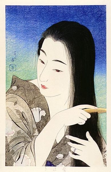 Editor: This is Hashiguchi Goyo’s ‘Kamisuki (Combing the hair)’ from 1920, created with woodblock print on silk. It’s a lovely image and feels very intimate; she’s captured in this simple domestic act. How do you interpret this work? Curator: Intimacy certainly arises from the masterful interplay of line and form. Notice the graphic quality of the bold black hair against the pale skin and subtly patterned kimono. The linear nature is what first captures my attention. How the artist creates dimension with such clear unwavering strokes. Editor: Yes, and even the negative space around the figure is quite striking. Curator: Precisely. The flatness enhances the subject's presence. Consider also how the curvilinear lines of her hair contrast with the geometric patterns of her kimono. There's an elegant tension in this juxtaposition of the organic and the structured. Does the balance and contrast impact your interpretation? Editor: It does, and the way the light catches the curve of her neck seems important too; it softens an otherwise stark contrast. What would you say the function is? Curator: The careful manipulation of light accentuates her delicate features, enhancing the feminine ideal represented here. It isn’t photorealistic and thus directs us to appreciate its formalism and craftsmanship. This visual language becomes a critical component in understanding the image. Editor: It’s amazing how much meaning can be drawn from just the formal elements of an artwork. Curator: Indeed. By understanding this approach, we uncover complex messages without necessarily resorting to contextual or historical readings. This enriches our understanding of not only this specific work, but of art in general.