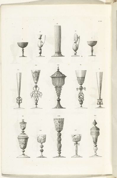 Curator: This etching by Charles Onghena, entitled "Kelken en pronkbekers, plaat XX," or Chalices and display cups, plate XX, dates from the late 1820s and showcases an array of elaborate glassware designs. Editor: Wow, it’s like a museum of impossible goblets! Some of these are so ornate, I can't imagine actually drinking out of them. It's more of a fantastical catalog than a practical guide. Curator: Exactly! Consider the historical context. Sumptuary laws, dictating who could own and display certain goods, had a real impact on consumption. Glassware like this became symbolic not just of wealth, but of social standing, power and identity. Onghena’s etching captures that complex relationship between objects and society. Editor: I’m getting a sense of both aspiration and restriction from this. Like, look at chalice XI— it's trying so hard! The over-the-top embellishment feels like a statement about the owner's ambitions. It also has a very clear male/female aesthetic—rigid lines mixed with very organic/sexual curves. I'm intrigued! Curator: The craftsmanship and artistry involved in creating these goblets served to assert status and display specialized technical abilities. Onghena’s technique, the precision of the etching and engraving, is meticulous; you see every curve and detail rendered with care. Editor: Agreed. It’s almost clinical in its detail. Looking at it from a modern angle, it makes me question what objects *we* use to signify wealth today. It all just makes you think of identity as a social performance, right? What props are in *my* personal play? Curator: That's a vital point. Our connection to objects is laden with these layered narratives of class, gender, and aspiration. Examining these historical artifacts prompts us to think critically about contemporary consumerism. Editor: It's funny to think that maybe one day someone will be studying *our* belongings with the same mixture of awe and "what were they thinking?". Curator: Precisely! Thank you for engaging, through your intuitive expressions, with these intersectional dialogues! Editor: The pleasure was all mine! This exercise helps underscore the importance of critically considering objects through various contemporary lenses.