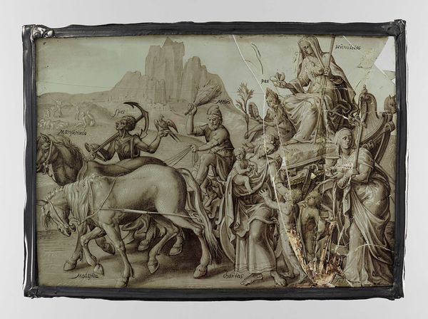 Editor: This drawing, "Ruit met De Triomf van de Oorlog (Bellum)," made after 1564, features charcoal, engraving, and other media. It seems like a complex, dramatic allegory with Mannerist features. What strikes me is the dynamic composition and how densely packed the figures are. What do you see in this piece? Curator: What immediately strikes me is the dominance of line and form. Note how the artist employed precise line work to delineate each figure and element within the composition, creating a stark contrast between light and shadow. Consider also the spatial arrangement: figures are placed in the foreground and background, establishing a pictorial field that engages the eye, prompting viewers to systematically scan the picture plane. It creates a deliberate complexity. Does this formal complexity contribute to its symbolic meaning? Editor: Absolutely, the crowded composition makes it feel overwhelming, mirroring the chaos of war. But does a formalist approach consider the symbolic meaning at all? It feels very intentional here. Curator: Indeed. A formalist approach acknowledges that form and content are inextricably linked. In "Bellum," the artist uses specific shapes and arrangements to express deeper symbolic ideas. Observe the recurring curves, the angles in the composition; they might be related to balance. How can the material handling reinforce or subvert the classical ideas the drawing gestures towards? Editor: That's fascinating. So by looking closely at the artistic choices, we can see how form gives shape to meaning. I hadn't considered that level of integration before. Curator: Precisely. Understanding the language of form allows us to decode the artwork's internal structure. That then provides insight into its representational function and, ultimately, the artist's communicative project. Editor: Thank you. I now have a much richer understanding of how formal analysis can deepen our appreciation of this intricate drawing.
