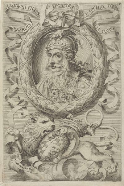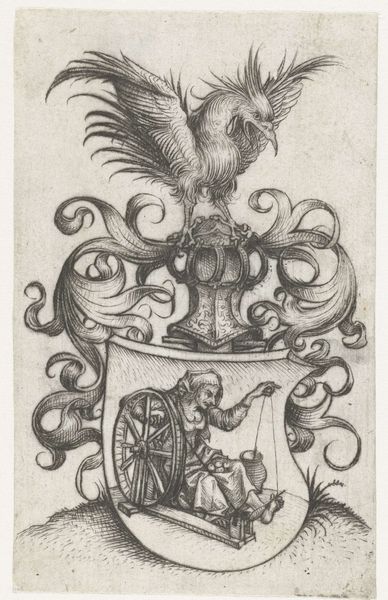 Editor: This is "Pauwen," made between 1667 and 1718 by Jan Griffier, a print using the engraving medium. I am immediately drawn to the tonal range and subtle gradients that creates such a visual texture across the image. How do you interpret this work? Curator: Let us focus on the structure first. Consider the composition—the prominent peacock is positioned asymmetrically, creating a dynamic tension. The eye is led from the regal bird, along the cascade of its tail, down to the chicks below, and then back again using the architectural geometry and the winding vines that adorn its surface. What does that visual pathway suggest to you? Editor: It seems very intentional. The textures create definition that reinforces that circular structure, keeping you contained in its own reality, not letting the background overtake the foreground in sharpness. So, it's using focus to achieve that. Is it meant to portray something about nature itself? Curator: Perhaps. Reflect on the interplay between natural and artificial forms. Notice how the rigid architecture contrasts the organic shapes of the peacocks and vines. How might you reconcile these disparate forms? Editor: Maybe it’s the tension of man's interventions against the backdrop of natural beauty, highlighting our need to coexist and frame the birds' opulence in order to truly appreciate it. Curator: Precisely. Furthermore, observe the Baroque style evidenced through complex ornamental detail. Griffier masterfully employed the engraving technique to simulate a wide tonal scale in a monochrome palette and thus, create illusionism on the paper itself. Editor: Seeing this from a structural standpoint, analyzing forms and how they interact has helped me think about how artists organize reality on a 2-dimensional plane and imbue the work with their perspective. Curator: Agreed. Decoding such elements not only enriches one’s viewing experience, it also unveils symbolic richness and depth inherent within each artist’s aesthetic system.